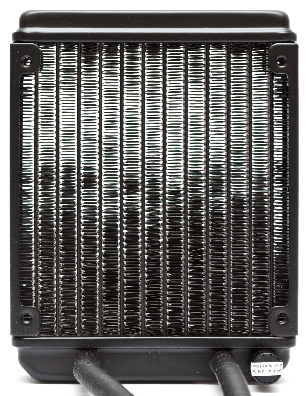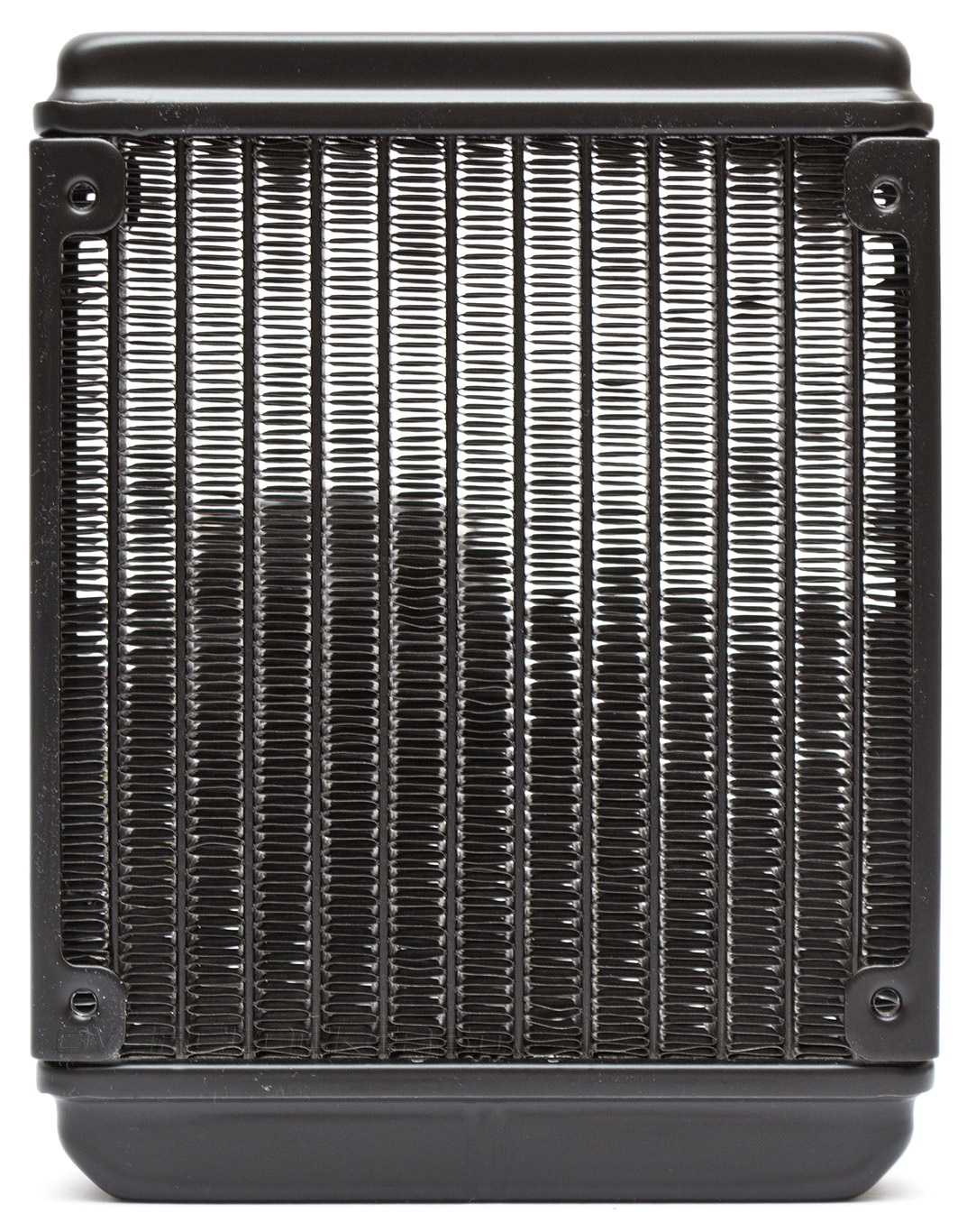 Структура радиатора классическая. Водяные каналы соединены тонкими лентообразными ребрами, расставленными с зазором в 1 мм. Несложно подсчитать, что суммарная площадь рассевания составляет чуть больше чем 2200 см2. Для обычного воздушного кулера эта цифра означала бы крайне низкую эффективность.