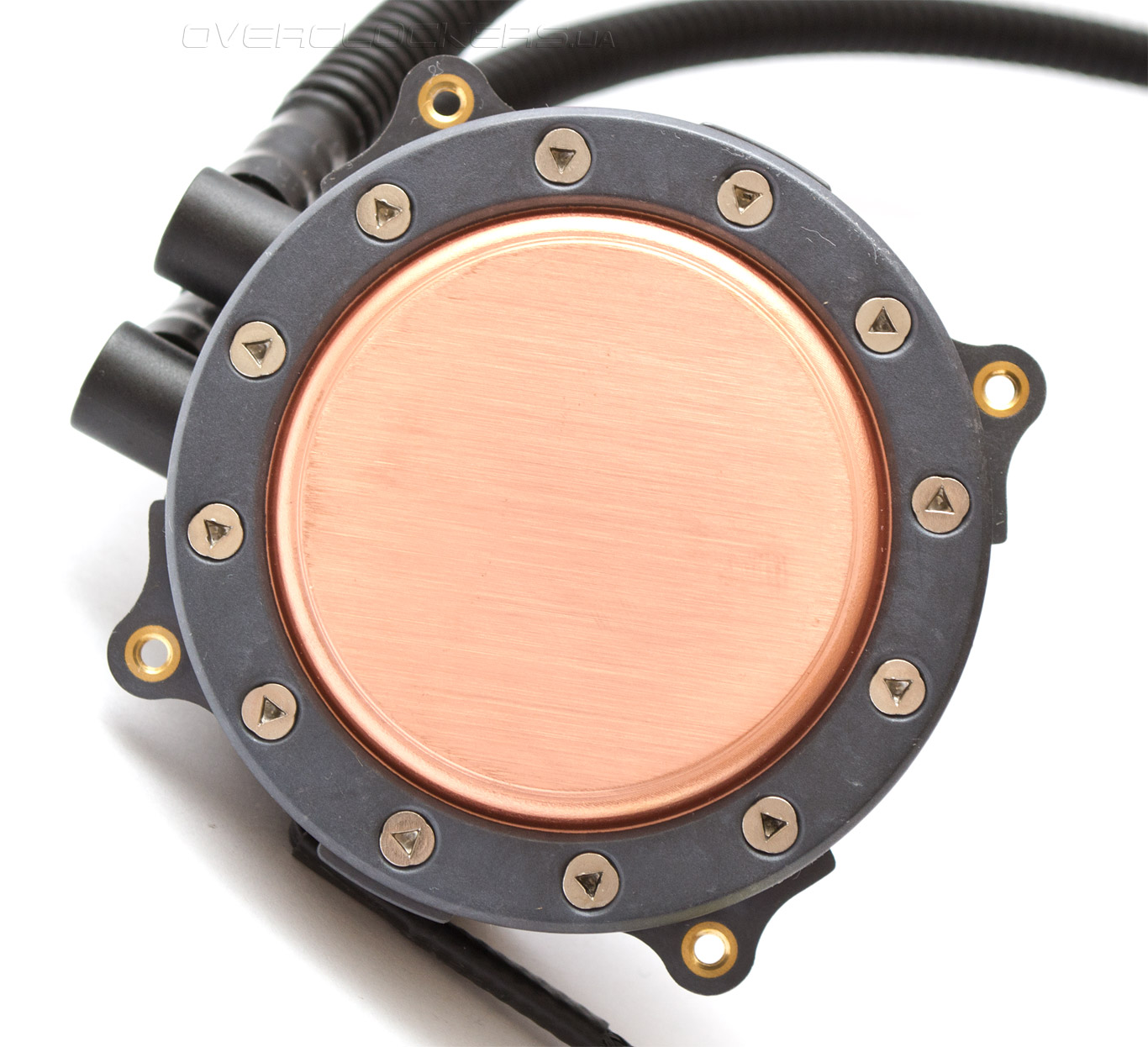 Основание водоблока полностью медное, диаметром 50 мм. Поверхность относительно ровная, с небольшим равномерным подъемом к центру. Производитель позаботился о невозможности технического обслуживания данного блока любопытными пользователями, закрепив подошву 12 трехгранными винтами.