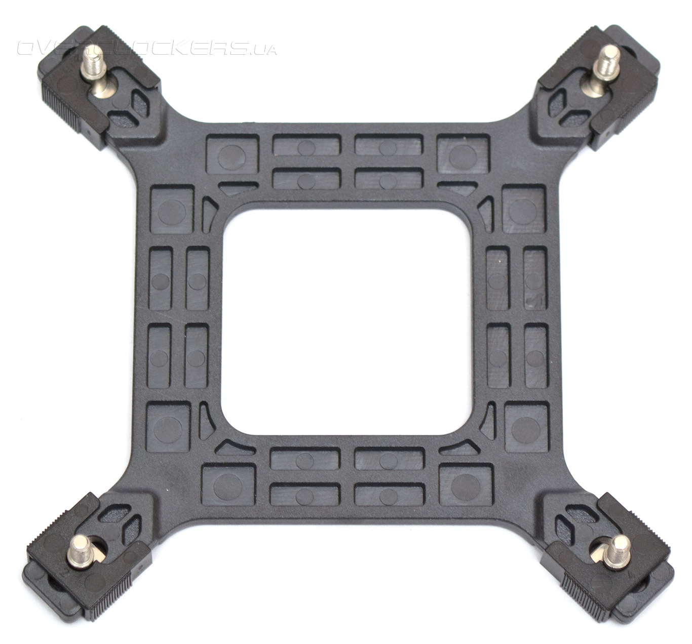 Cooler Master Seidon 120M можно смонтировать на все актуальные процессорные платформы. Мы рассмотрим установку на примере сокета Intel LGA1155, поскольку принципиальных отличий от других процессорных разъемов в порядке действий нет. Сборка начинается с установки шпилек на усилительной пластине в нужное «среднее» положение.