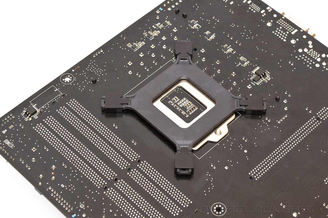 Потом следует вставить усилительную пластину в соответствующие отверстия на тыльной стороне материнской платы.