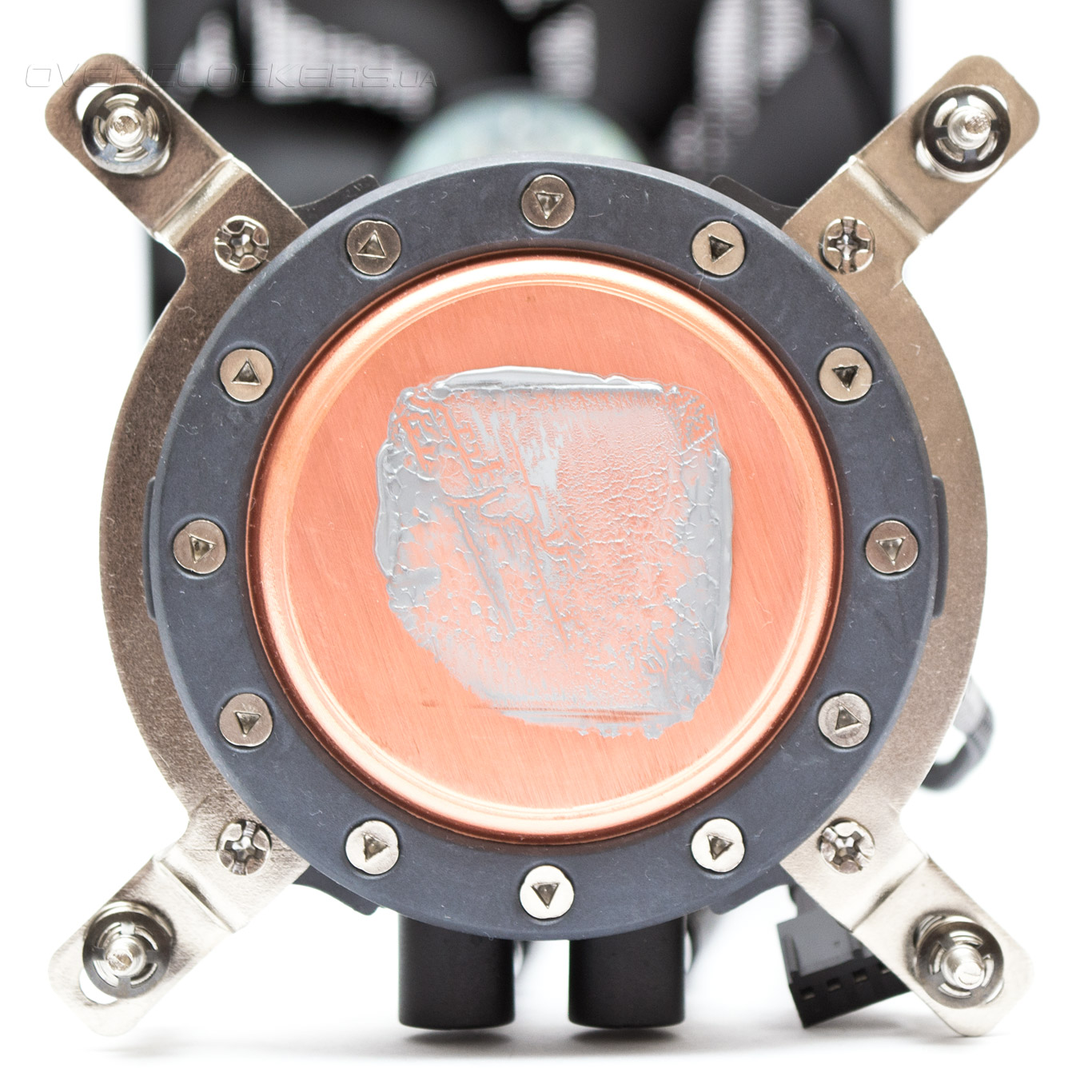 Отпечаток на основании выглядит не очень хорошо, но достаточный для нормального теплообмена контакт присутствует. В смазанном уголке внизу слева виновата не очень ровная крышка тестового процессора.