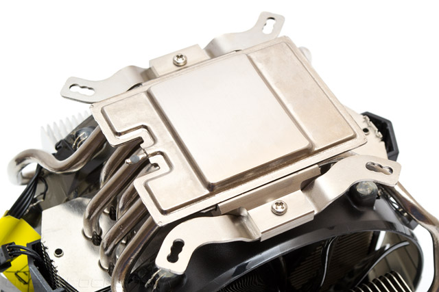 Тепловые трубки припаяны к испарительной камере. Кроме того, они уложены в желоба массивной металлической пластины, по совместительству выполняющей функцию прижимной рамки.