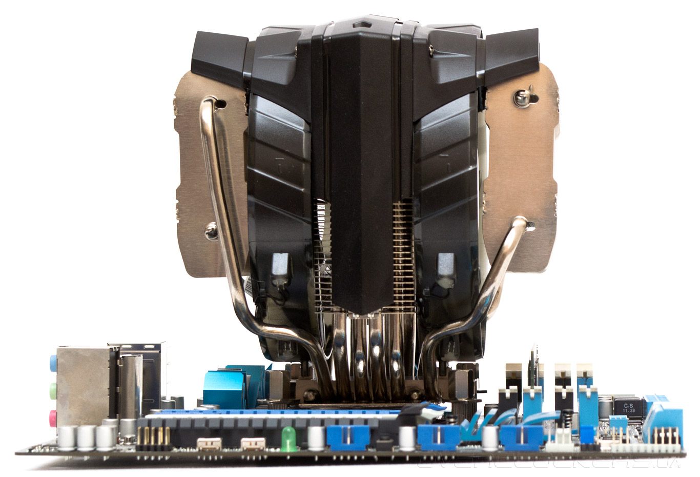 Радиаторных ребер в центральной секции насчитывается 45 штук, тепловых трубок восемь, диаметром 6 мм каждая. Четыре в центре и по две в боковых радиаторах. Боковые трубки разведены под причудливыми углами, чтобы оставить с одной стороны пространство для вентиляторов, а с другой — для памяти. В секции входят зеркально, навстречу друг другу. В центральном радиаторе трубки пролегают U-образно.