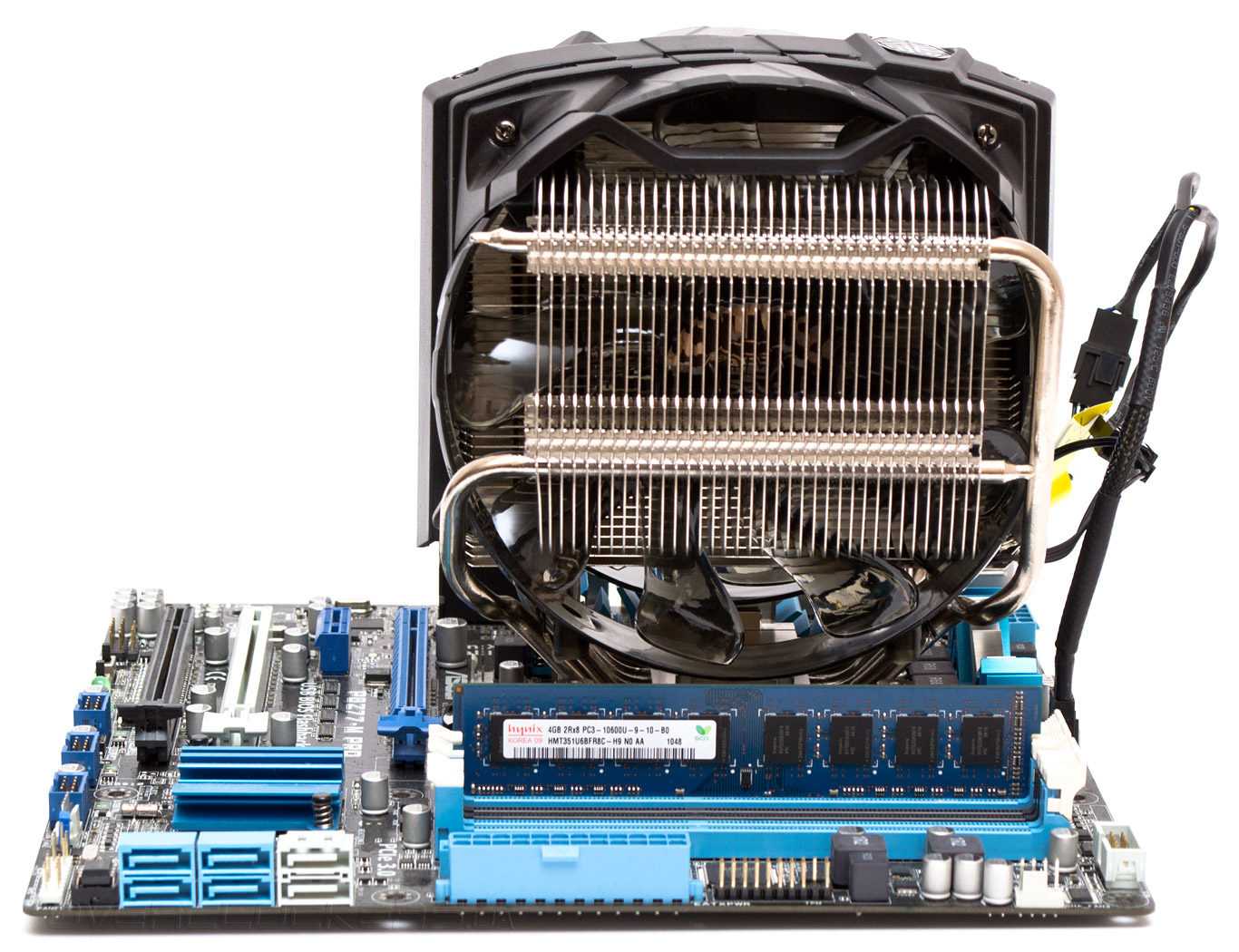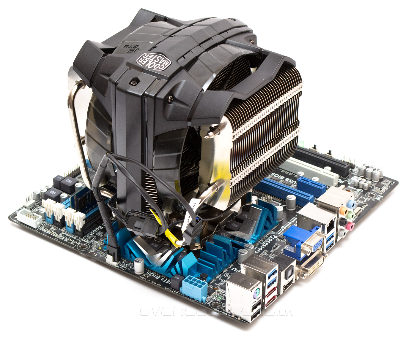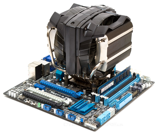 В сборе Cooler Master V8 GTS выглядит пристойно, его габариты не кажутся чрезмерно большими. Однако он вряд ли подойдет владельцам материнских плат формата MicroATX или плат, перегруженных крупными радиаторами силовых цепей в районе процессорного разъема.