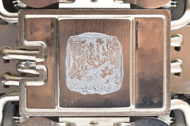 При повороте кулера на 90 градусов ничего радикально не меняется, кроме того, что первые два слота памяти перекрываются уже вплоть до размера стандартных планок. Все еще остается конфликт с первым слотом PCI-E. Поэтому мы даже не стали снимать данные ракурсы для фото. Отпечаток термоинтерфейса получился хорошим, указывающим на высокую силу прижима основания к крышке процессора.