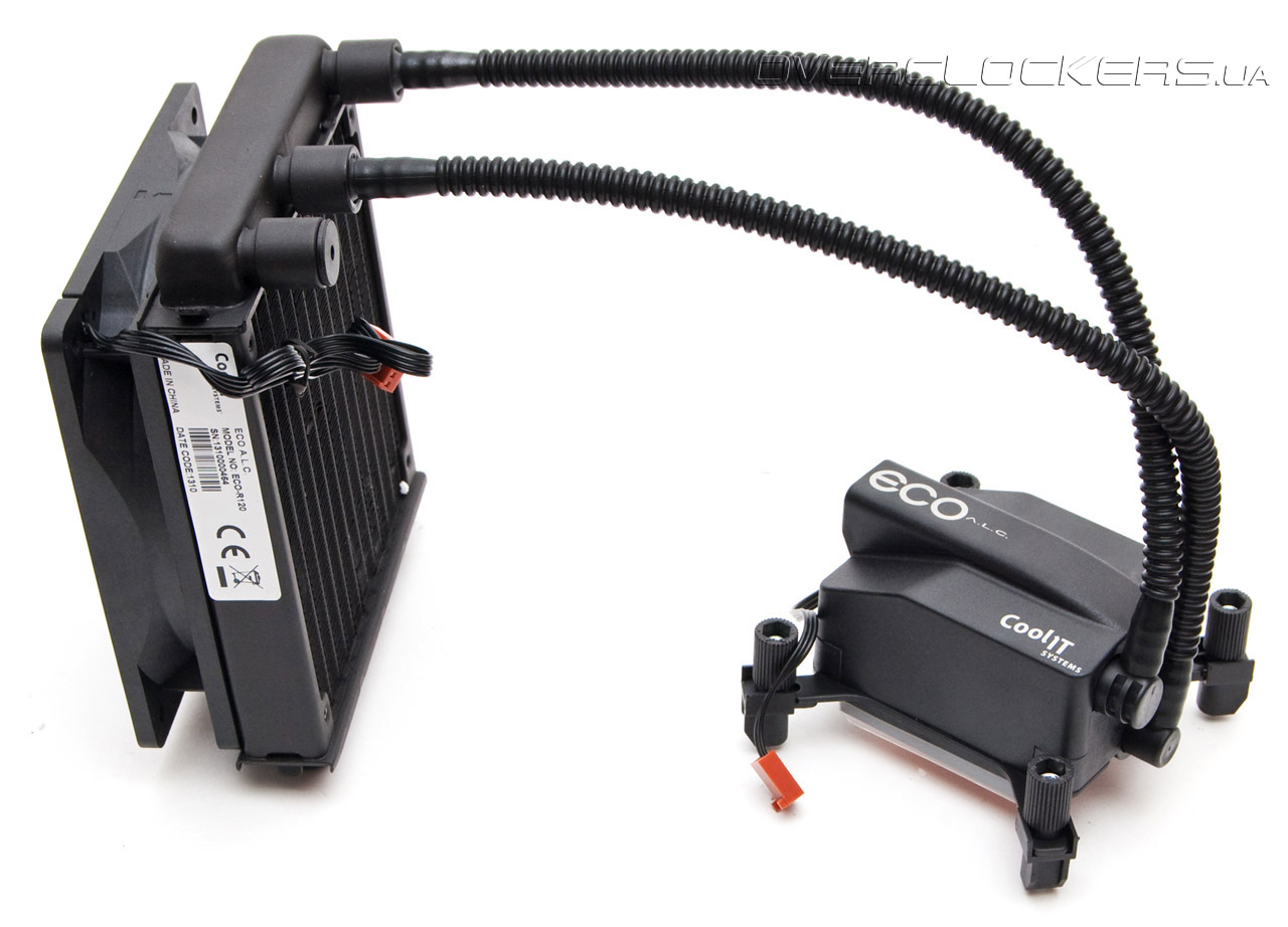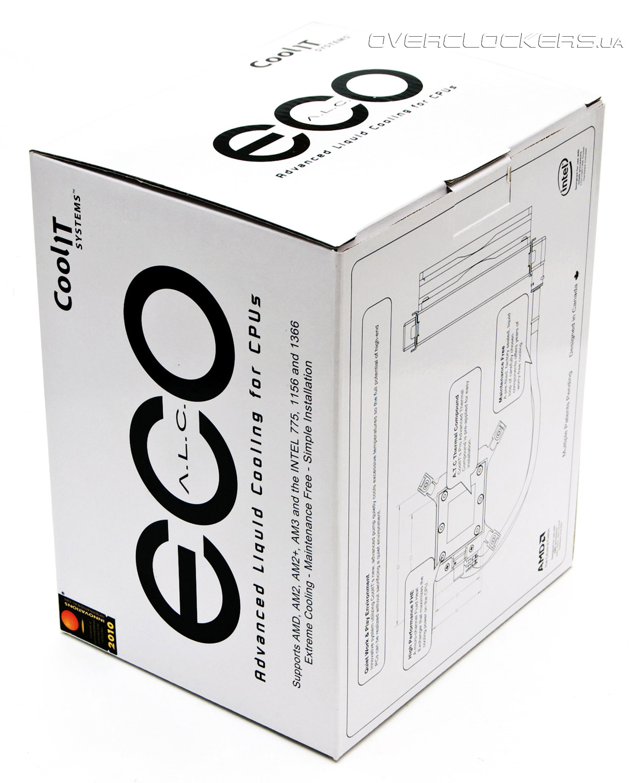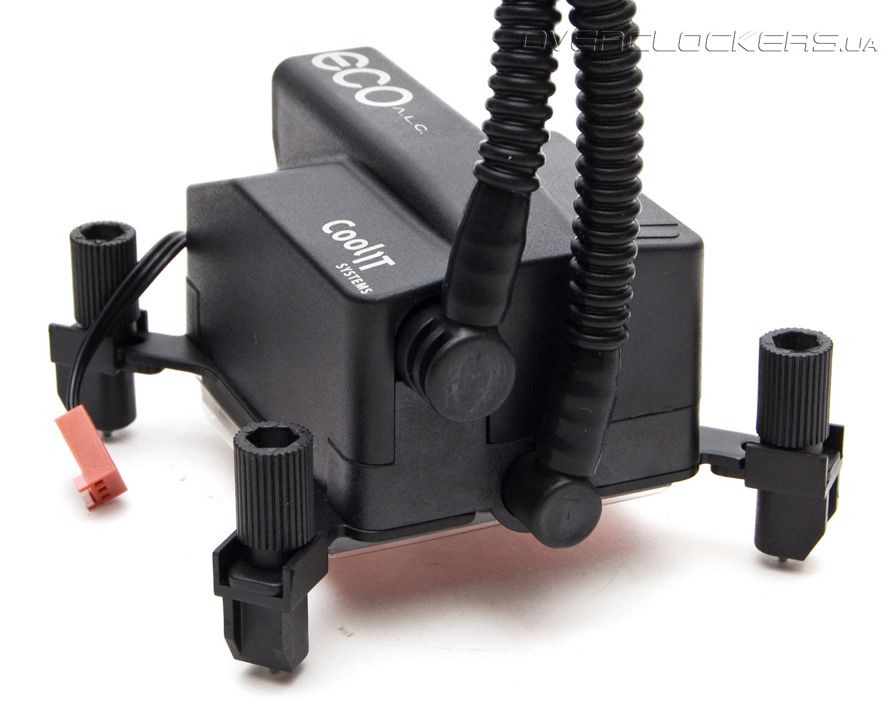 В то время как большинство высокопроизводительных СВО включают водоблок, помпу, расширительный бачок, активно охлаждаемый радиатор и набор шлангов, CoolIT ECO A.L.C. обходится без отдельного резервуара, а небольших размеров помпа составляет одно целое с водоблоком. Поставляемый в комплекте крепежный набор обеспечивает совместимость с материнскими платами Intel LGA775/1156/1366 и AMD AM2(+)/AM3, что, конечно же, является несомненным плюсом.
