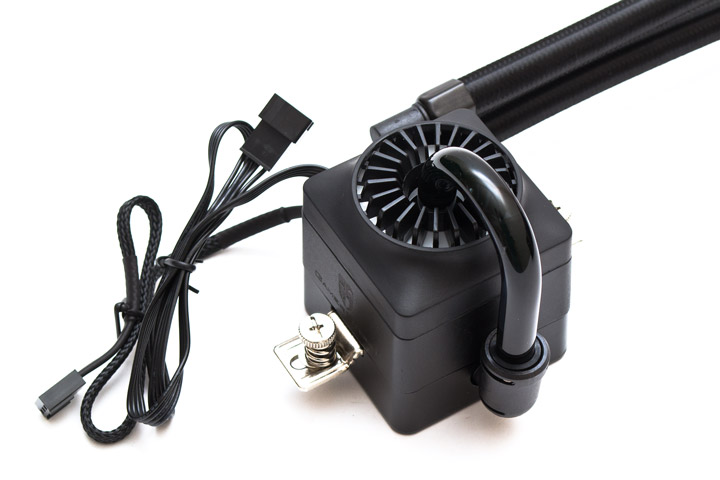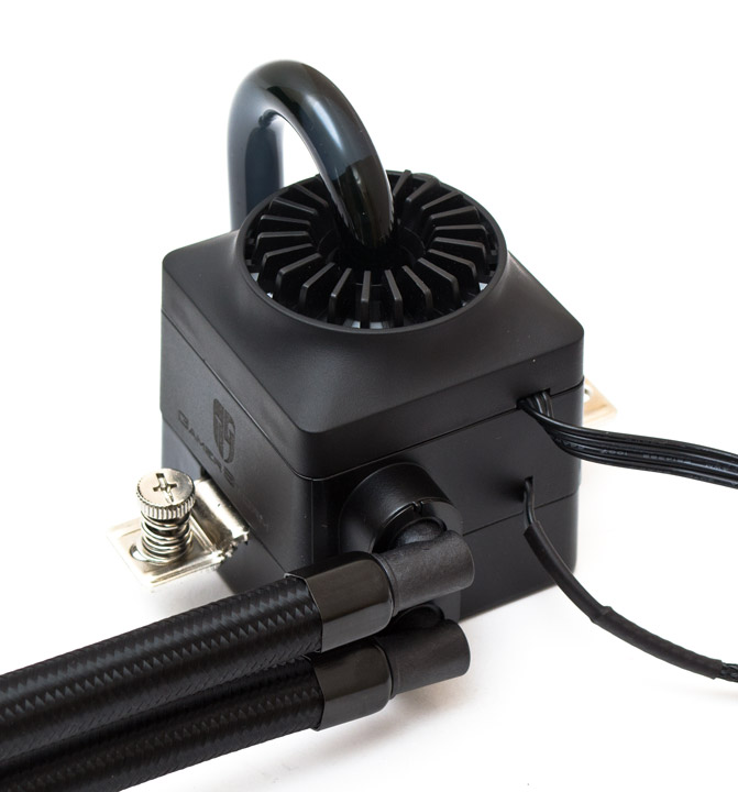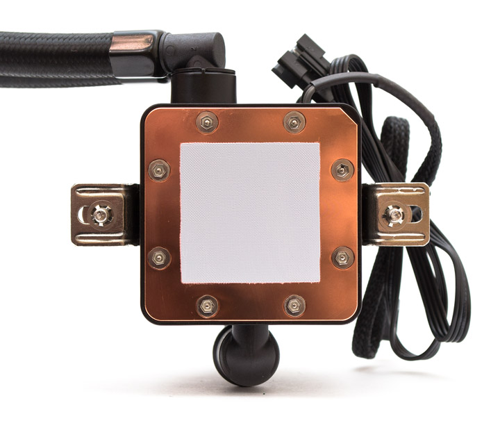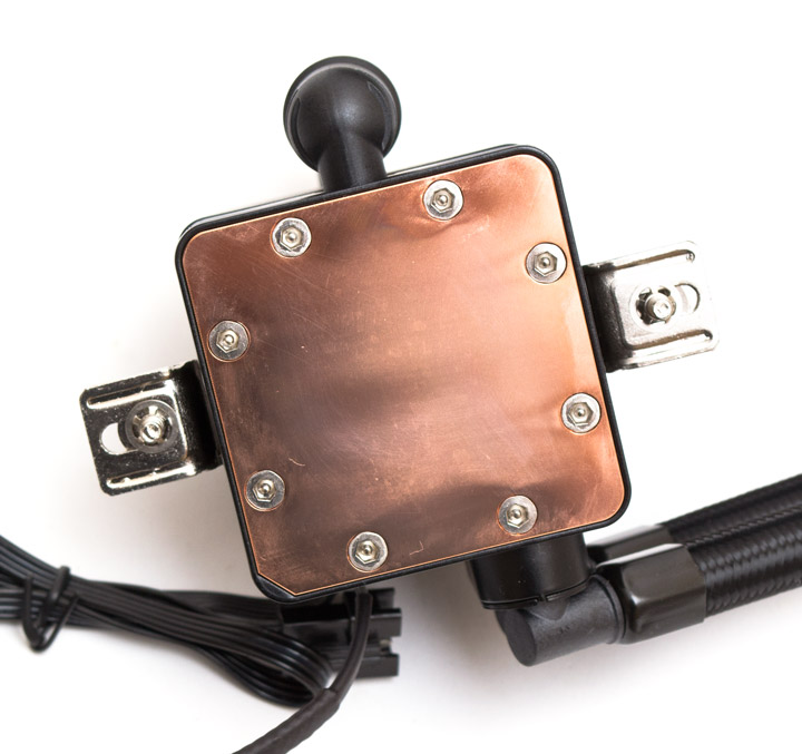 Встроенная помпа имеет керамический подшипник с прогнозируемым сроком наработки на отказ в 120000 часов и трехфазный электрический двигатель. Работает на постоянной скорости в 2200 об/мин, при этом уровень шума по нашим замерам не превышает 37 дБ (А), а в фоне нет острых паразитных призвуков. Другими словами, устройство работает очень тихо, и понижение скорости ему не требуется. Два металлических прижимных крепления в виде подпружиненных винтов встроены прямо по бокам водоблока.