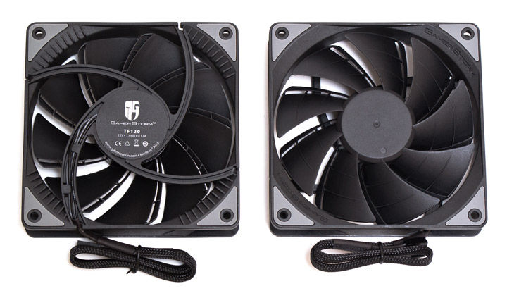 Два комплектных вентилятора формата 120х120х25 мм имеют стандартную рамку с наклеенными не ней по углам резиновыми демпферами серого цвета. Они относятся к серии Gamer Storm TF120 и построены на гидравлическом подшипнике, скромно, но объективно обещающем всего 50000 часов наработки на отказ. Из интересных моментов стоит отметить устройство крыльчатки, имеющей девять лопастей, на задней кромке которых добавлено дополнительное крыло, для увеличения уровня статического давления. Диапазон доступных скоростей составляет от 500 до 1800 об/мин, регулируется при помощи ШИМ. Из посторонних звуков слышно шорканье электроники в районе двигателя, которое возрастает пропорционально росту скорости. Бесшумный диапазон находится в районе 500–700 об/мин и 35–40 дБ (А). Умеренный, но хорошо различимый уровень шума из закрытого корпуса наступает на 1200–1300 об/мин и 53–54 дБ (А). Все что выше и вплоть до 1800 об/мин и 64 дБ (А) — это уже очень сильный аэродинамический шум. Шнур подключения к питанию четырехконтактный, в нейлоновой оплетке, длиной в 270 мм.