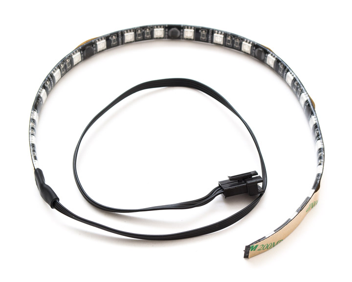А вот и сама лента. Общая ее длина составляет 350 мм, по ней равномерно распаян 21 RGB-диод. Сверху вся электроника ленты ламинирована, потом даже попадание сюда жидкости вряд ли вызовет серьезные последствия. С обратной стороны ленты наклеен двухсторонний скотч. Длина кабеля питания составляет 380 мм, заканчивается он нестандартным четырехконтактным RGB-разъемом с защелкой.