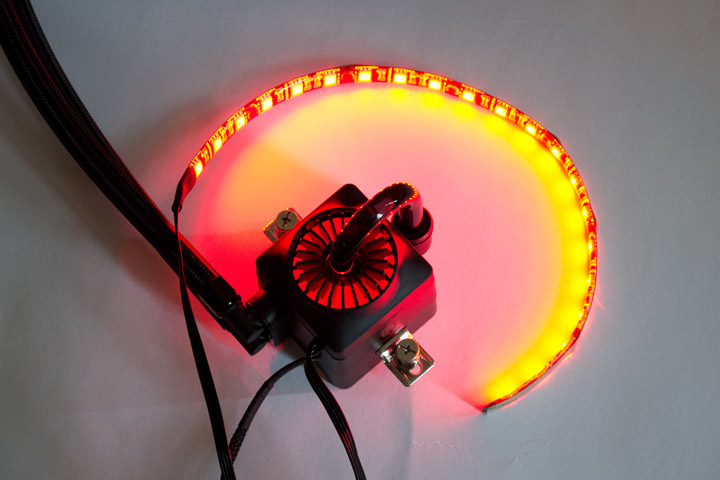 Подсветка ленты и водоблока выглядит следующим образом: при подключении к подходящей материнской плате есть возможность задать любой из 16,8 млн. комбинаций цветов и световых эффектов. Белый цвет все диоды воспроизводят корректно.