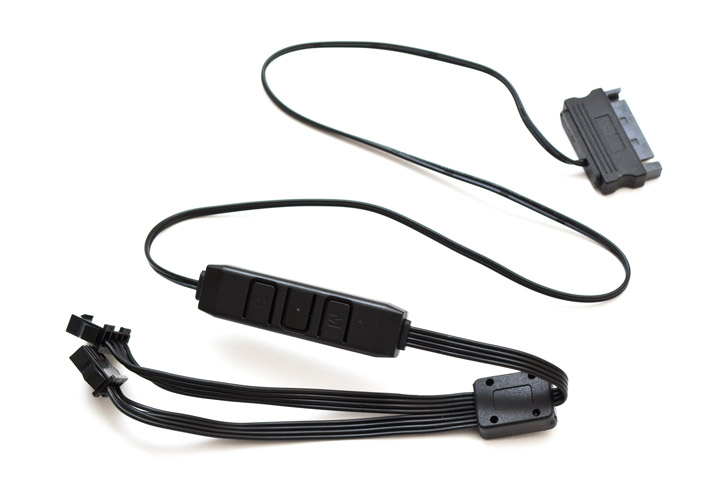На случай, если подходящей материнской платы нет, компания Deepcool положила в комплект собственный RGB-пульт. Для питания используется разъем SATA Power, длина шнура составляет 395 мм. Пульт имеет длину 55 мм и три кнопки. Клавиша «М» отвечает за циклическую смену режимов и цветов подсветки. Пульт позволяет воспроизводить красный, зеленый, синий, оранжевый, фиолетовый, голубой и белый цвета, причем как в режиме постоянного свечения, так и «дыхания». После этого идет три режима со сменой цветов, затем все повторяется. Средняя клавиша позволяет регулировать яркость подсветки в пяти уровнях. Если зажать ее на несколько секунд, то подсветку можно отключить полностью. Кнопка «S» позволяет выбрать скорость воспроизведения текущего эффекта, в пяти вариантах, от медленного до очень быстрого. Длина проводов двух разъемов, которые подключаются к вентилятору и радиатору составляет 170 мм.