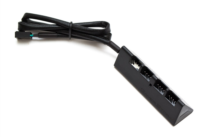 Комплектный разветвитель питания тоже представляет собой интересное устройство. Эта треугольная в профиль коробочка позволяет повесить на один четырехконтактный порт сразу четыре вентилятора и управлять их скоростью с помощью ШИМ-сигнала. Скорость будет считываться только от устройства, включенного в первый порт, отмеченный белым цветом. Если ШИМ-управление не поддерживается, на пропеллер просто будут подаваться постоянные 12 В, и он будет работать на максимальной скорости. Длина шнура в нейлоновой оплетке — 420 мм, само устройство имеет длину в 75 мм и ширину одной грани в 20 мм. Продается в магазинах отдельно и может пригодиться тем, кому не хватает свободных разъемов.