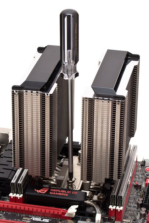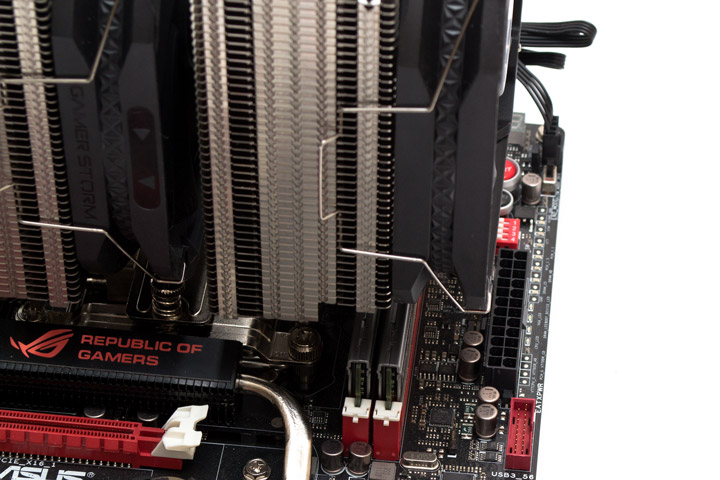 Помимо целого ряда преимуществ, есть у Assassin III и некоторые недостатки. И главный из них — это очень большие габариты. Если NH-D15 действительно можно вместить в рамки ограничения по высоте в 165 мм, то здесь даже со стандартной по высоте памятью мы получим не менее 169 мм. Удивительно, что видеокарте радиатор все же не мешает, хотя во многом это зависит от положения процессорного разъема. По мелочам же можно придраться к пластмассовой (а не металлической) усилительной пластине, впрочем, учитывая ее прочность, это лишь мелочная претензия.
