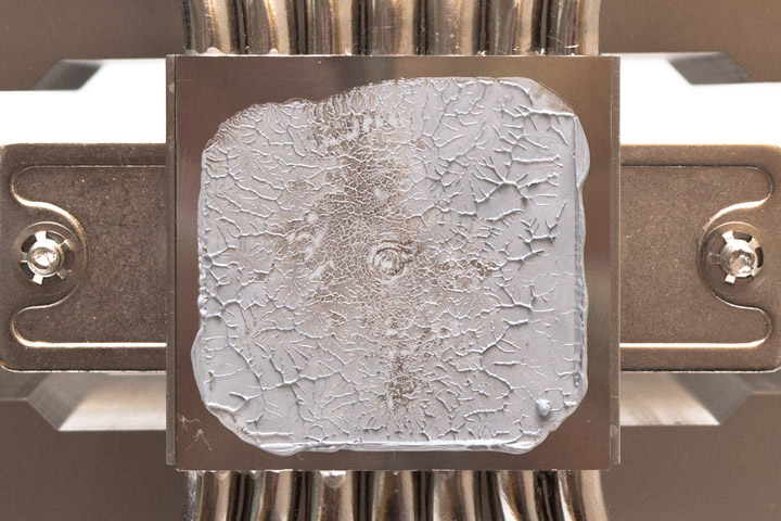 Отпечаток на подошве кулера выглядит очень убедительно и свидетельствует об отличном прижиме к процессору. Видны даже концентрические круги в центре. Хорошей теплопередаче здесь ничто не мешает.