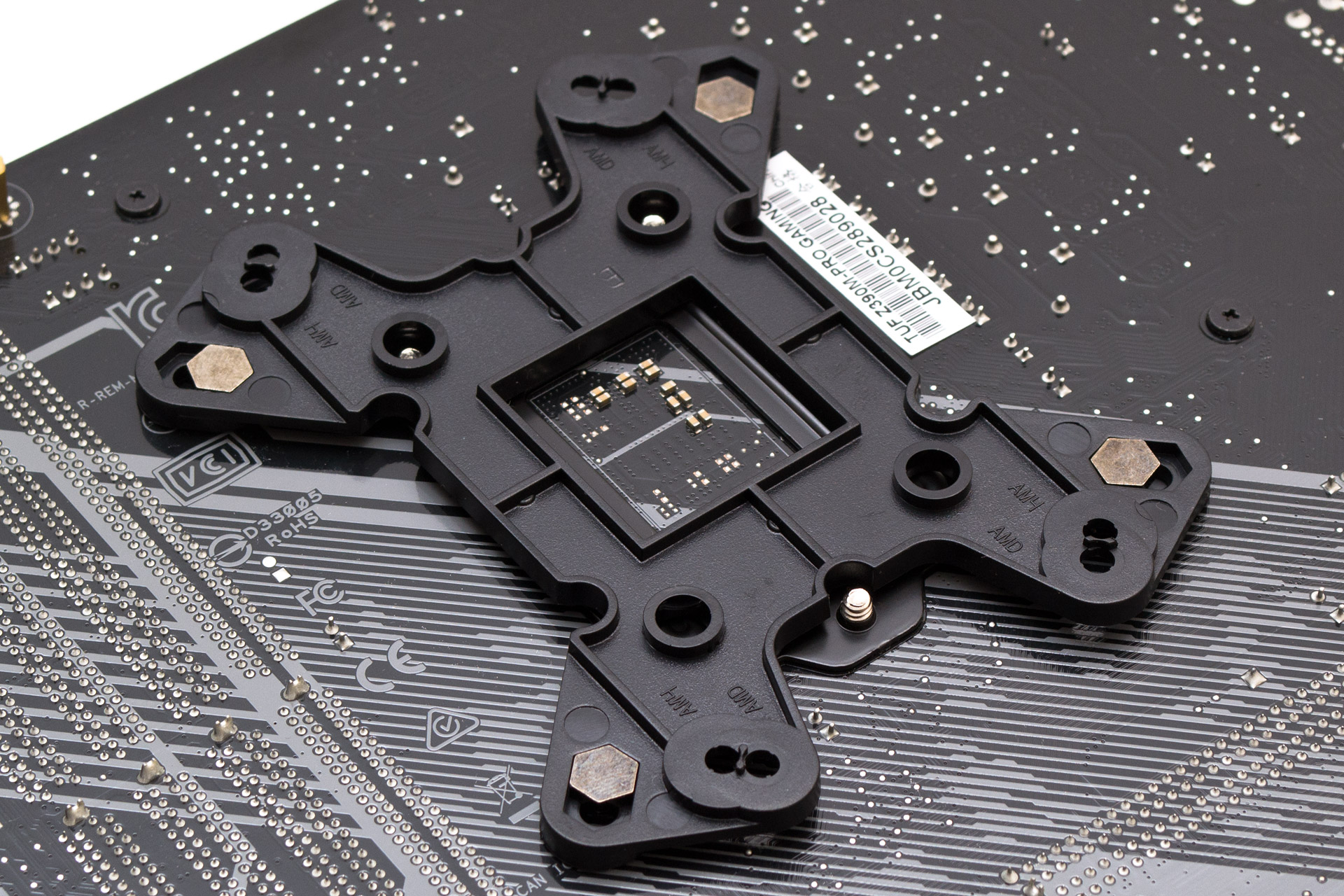 Затем усилительная пластина вставляется в монтажные отверстия материнской платы.