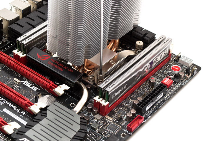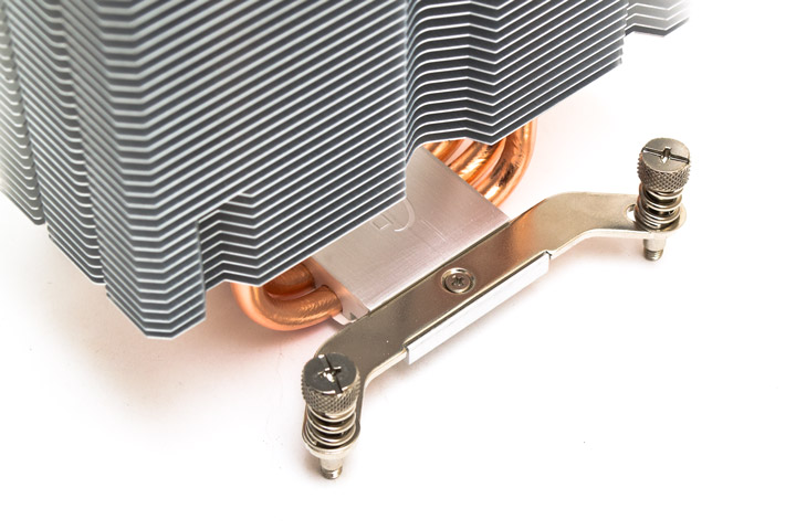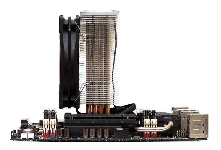 Вентилятор крепится к радиатору с помощью проволочных скоб. По глубине устройство получается относительно узким, что внушает надежду на хорошую совместимость по высоте с оперативной памятью.