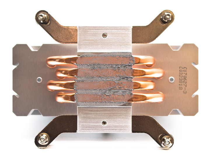 Основание выполнено по технологии прямого контакта. Зазор между трубками составляет 2 мм. Подошва относительно ровная, но качество шлифовки и обработки тут оставляет желать лучшего.