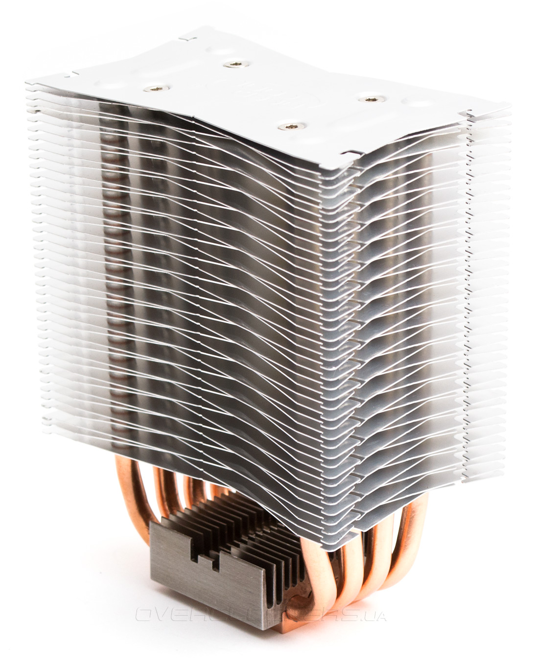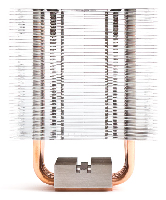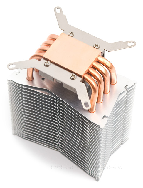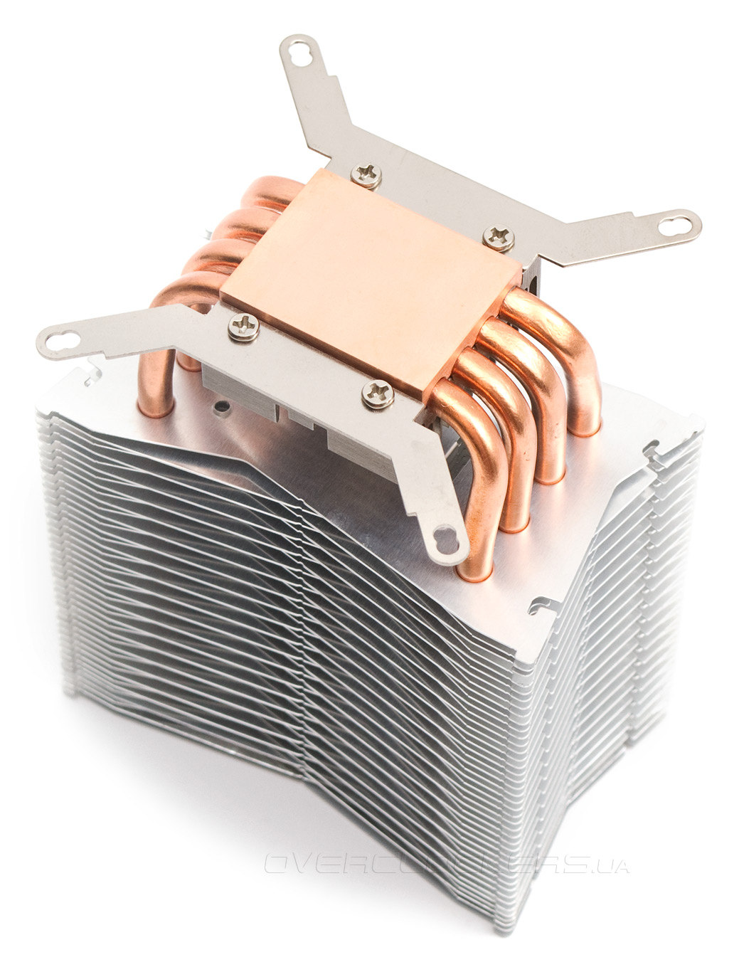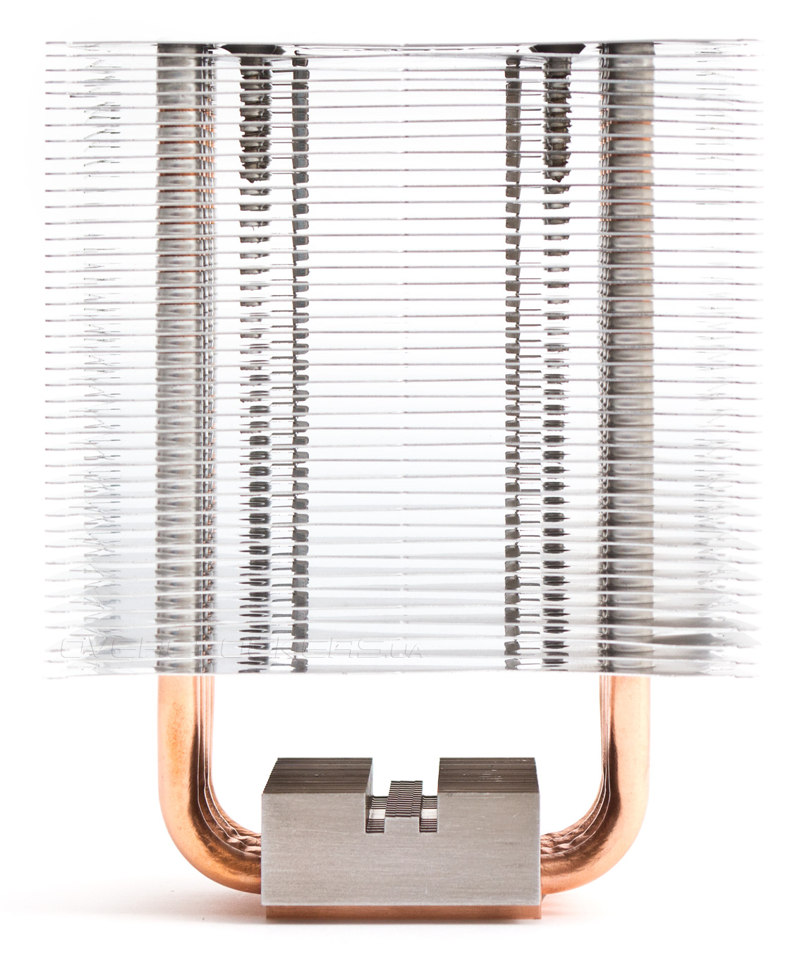 Радиатор состоит из U-образных тепловых трубок, выстроенных в ряд, друг за другом. В высоту он достигает 128 мм, а в ширину — 100 мм. Хотя толщина ребер и не превышает 0,4 мм, зато межреберное расстояние сделано на уровне лучших кулеров и дотягивается до 2 мм.