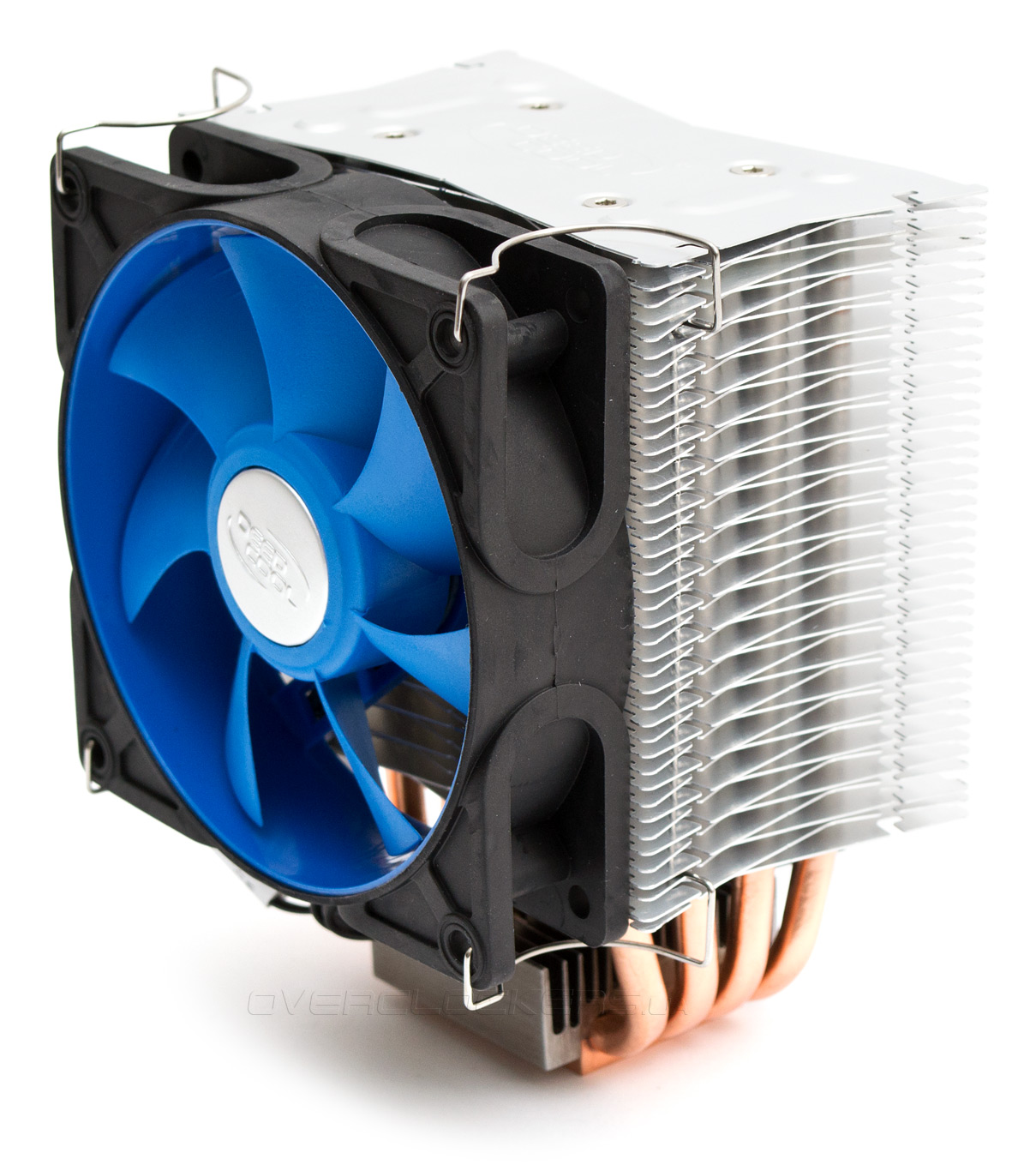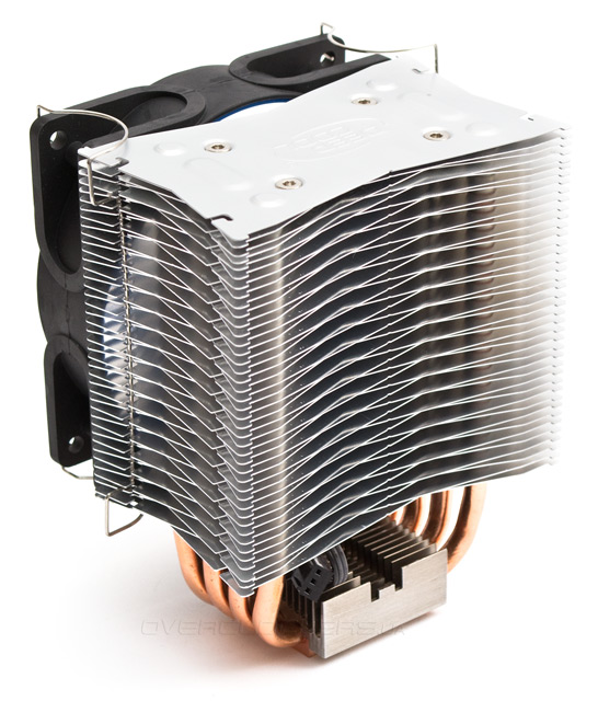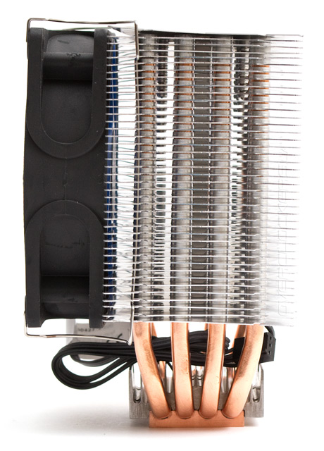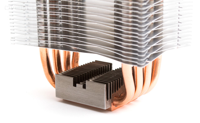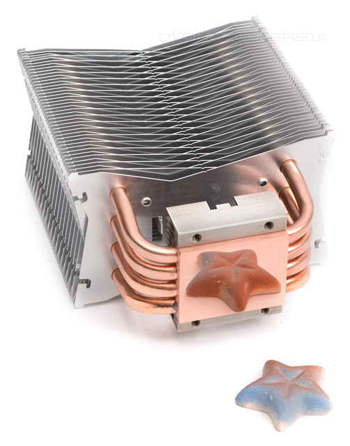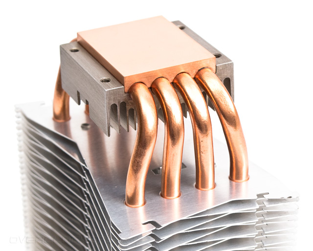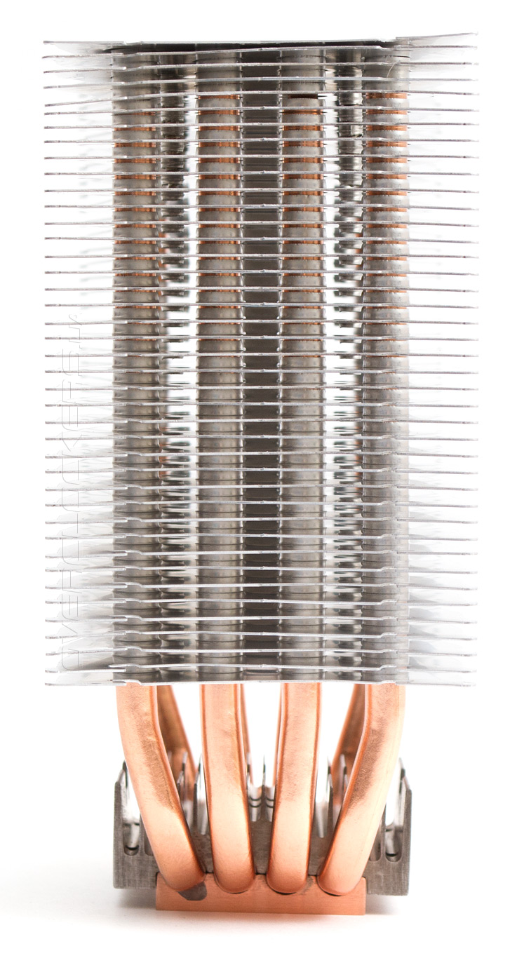 Радиатор состоит из U-образных тепловых трубок, выстроенных в ряд, друг за другом. В высоту он достигает 128 мм, а в ширину — 100 мм. Хотя толщина ребер и не превышает 0,4 мм, зато межреберное расстояние сделано на уровне лучших кулеров и дотягивается до 2 мм.