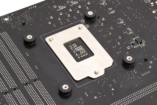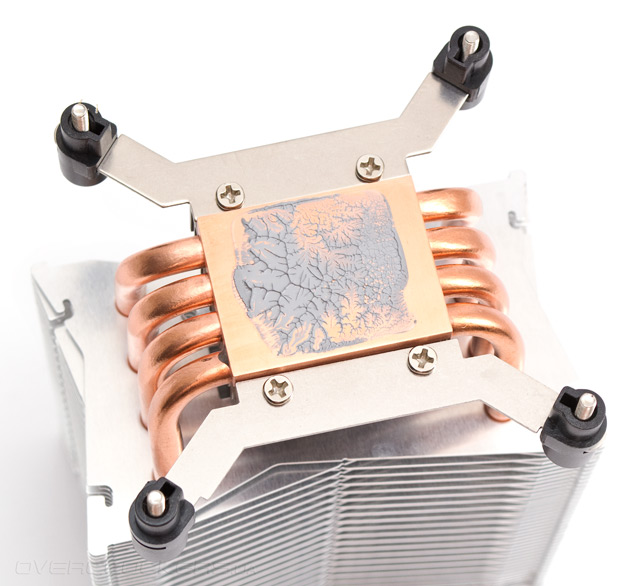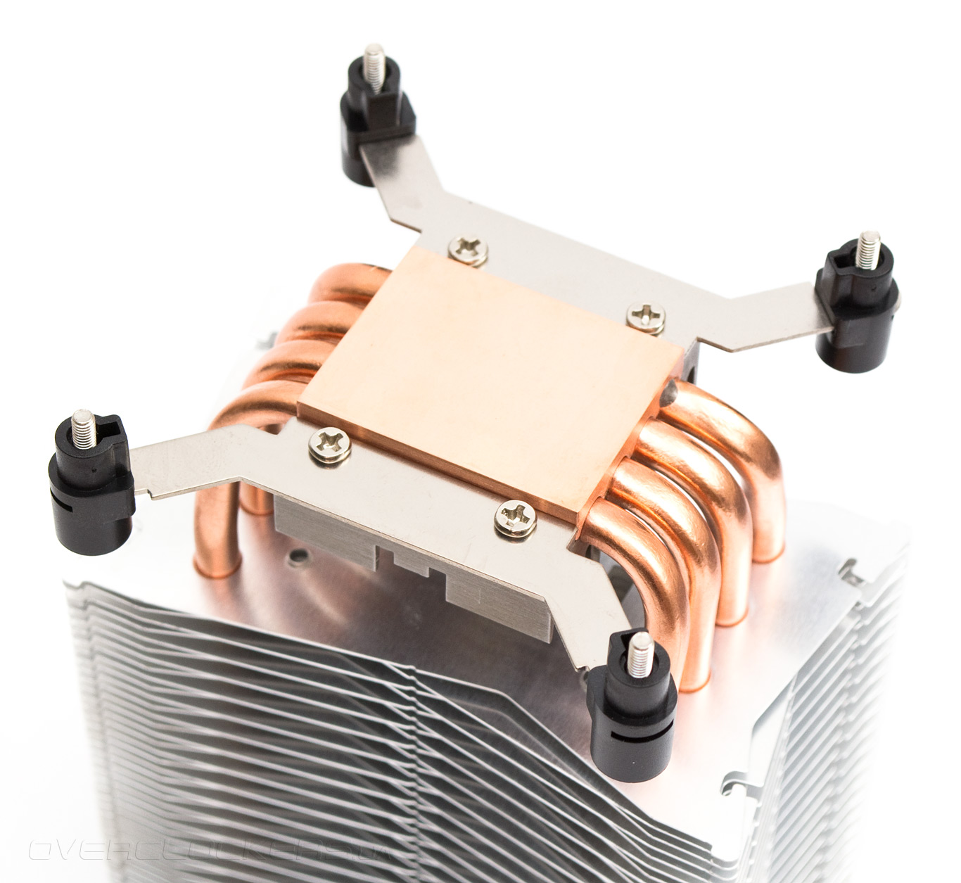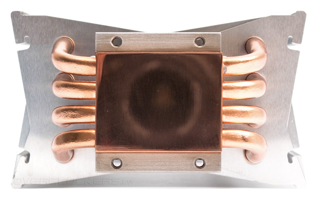 Над основанием надстроена гребенка небольшого радиатора, который играет роль упора для крепежной скобы под сокеты AMD, и к которому привинчиваются с обратной стороны крепежные лапы кулера для сокетов Intel.