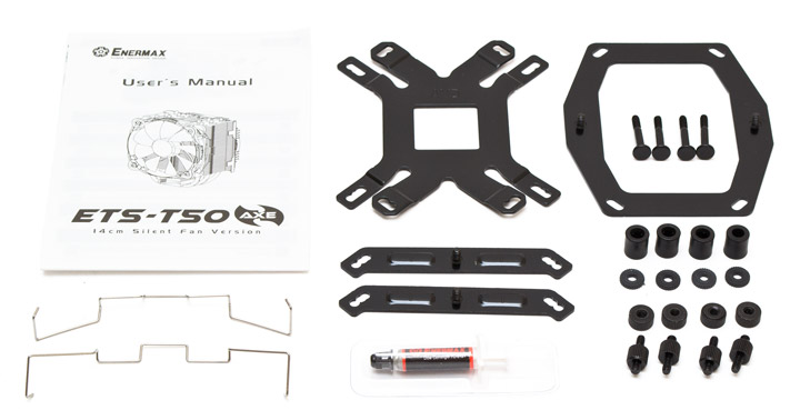 Комплект поставки не претерпел существенных изменений, не считая скоб для крепления кулера. Как и раньше, большинство деталей окрашено в черный цвет, в тон кулеру. В перечне деталей есть:
