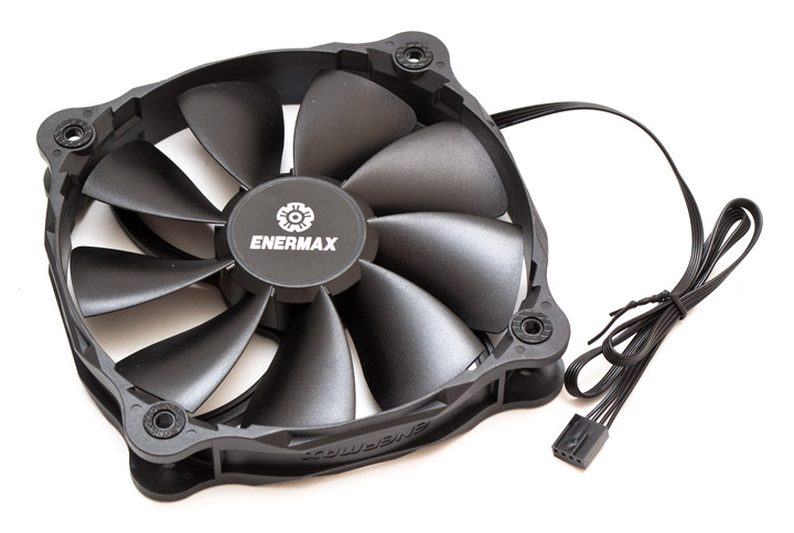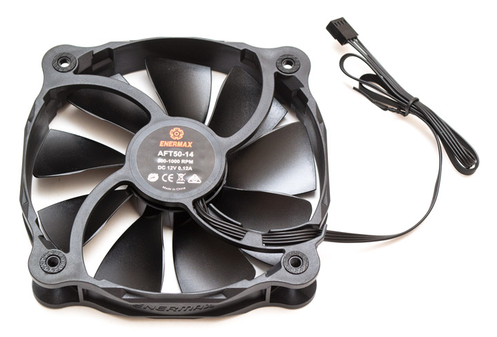Новый 140-мм вентилятор называется Enermax AFT50-14. Его рамка сделана таким образом, что посадочные отверстия с прорезиненными нашлепками занимают положение, аналогичное 120-мм моделям. Крыльчатка состоит из девяти крупных и пологих лопастей. Ее крайне узкий диапазон скоростей вращения управляется при помощи ШИМ и составляет всего лишь от 500 до 1000 об/мин. Подшипник представляет собой фирменную вариацию на тему гидродинамика и называется Twister Bearing. По сути, это самосмазывающаяся втулка, усиленная магнитом для стабилизации оси вращения. Наработка на отказ заявлена в пределах 160 тысяч часов. По части шумности все очень хорошо до 700 об/мин (40 дБ (А)). На полном ходу получаем 48 дБ (А) и кулер уже отчетливо слышно из закрытого корпуса. К счастью, хотя бы паразитные призвуки минимальны и не портят собой общую акустическую картину. Шнур питания ленточный, на четыре контакта, длиной в 500 мм. Интересно, что на коробке есть упоминание про съемные лопасти, но больше об этом нигде не говорится. Потому мы решили не рисковать и не пытаться их снять — здравый смысл взял верх над любопытством.