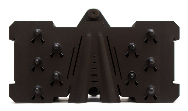 V-образный выступ смотрится агрессивно, но не факт, что он имеет какой-то практический смысл. Тепловые каналы расположены по оптимальной трапециевидной схеме, при которой тепло распределяется на всю площадь пластин равномерно, а сами трубки не мешают продувать радиатор.