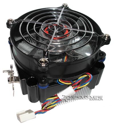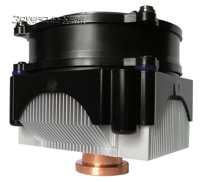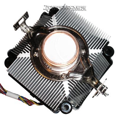 Но FCU999HCSAC все же отличается от бюджетных моделей своей конструкцией. Кулер состоит из алюминиевого радиатора, по форме напоминающего последние боксовые решения под Socket 478, 92-мм вентилятора и медного сердечника диаметром 25 мм, на выступающем конце которого припаяно (приклеено?) медное основание, контактирующее с крышкой процессора.
