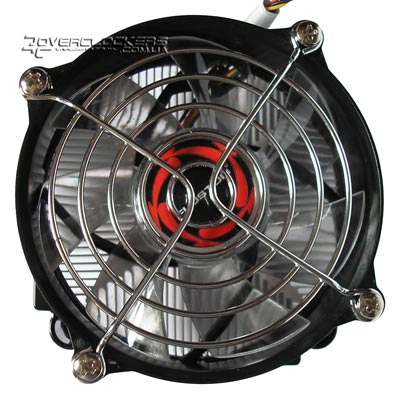 В качестве вентилятора используется нестандартная 92-миллиметровка накрытая грилем, питание которой осуществляется по 4-контактному разъему. При условии поддержки со стороны системной платы функции PWM имеется возможность управлять вентилятором в пределах 500-2500 об/мин (максимальная частота вращения нашего экземпляра составляла около 2550 об/мин), максимальный уровень шума при этом составляет 29 dB.