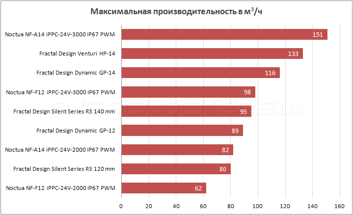 В полученных данных по максимальной производительности без сомнений лидируют те вентиляторы, которые имеют большую скорость и больший размах крыльчатки. Они же по совместительству являются и самыми громкими на предельных оборотах. Исключение составляет разве что Fractal Design Dynamic GP-14, который и дует хорошо, и звучит относительно тихо. Noctua NF-A14 iPPC-24V-3000 IP67 PWM становится лидером по уровню шума и производительности в данном заезде, а второе место занимает Fractal Design Venturi HP-14, который работает чуть с меньшей мощностью, но далеко не намного меньшим уровнем шума.