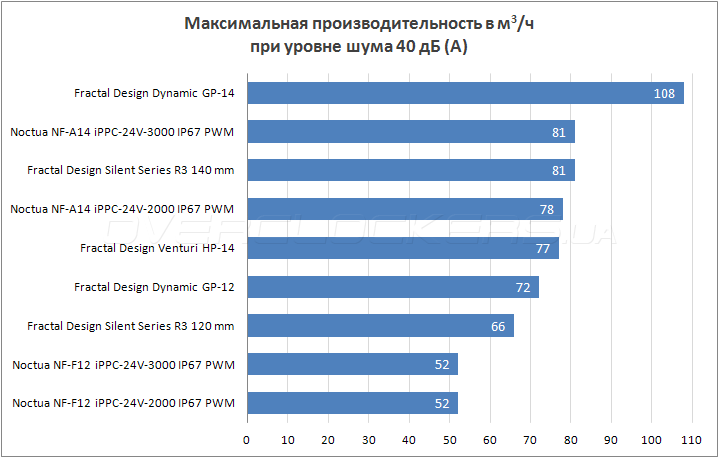 При сравнении результатов производительности вентиляторов на фиксированном уровне шума в 40 дБ (А) убедительную победу по объемам прокачиваемого воздуха получает Fractal Design Dynamic GP-14. Второе место делят между собой Noctua NF-A14 iPPC-24V-3000 IP67 PWM и Fractal Design Silent Series R3 140mm. Справедливости ради стоит отметить, что изделие Noctua в данном случае будет иметь преимущество по статическому давлению благодаря конфигурации своих лопастей, потому Silent Series R3 140mm отправляется на третье место. Явными аутсайдерами в таких условиях становятся две 120-ки от Noctua, поскольку создать ощутимый поток на низких оборотах они не способны, опять же — из-за конфигурации крыльчатки.