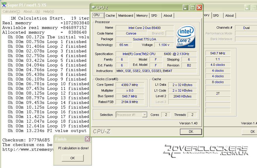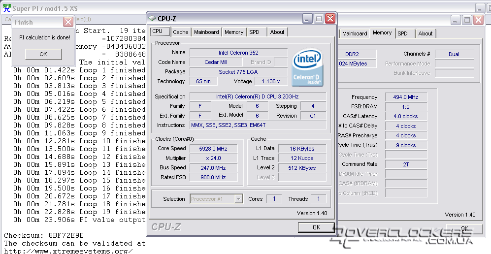 В скобках указана температура испарителя. Плюсовые температуры в нагрузке, конечно, могут пугать, но ведь это тестовая утилита, а в повседневном использовании подобные нагрузки получить невозможно. Результаты разгона процессоров не менее впечатляющие. Максимальная частота, при которой Е6400 прошел валидацию, составляет 4,45 ГГц, а Celeron D 352 – 6,1 ГГц - практически двукратный прирост частоты. Благодаря Asetek VapoChill LS я добился прохождения SuperPi 1M за 13,23 секунды на первом процессоре и за 23,91 сек. на втором.