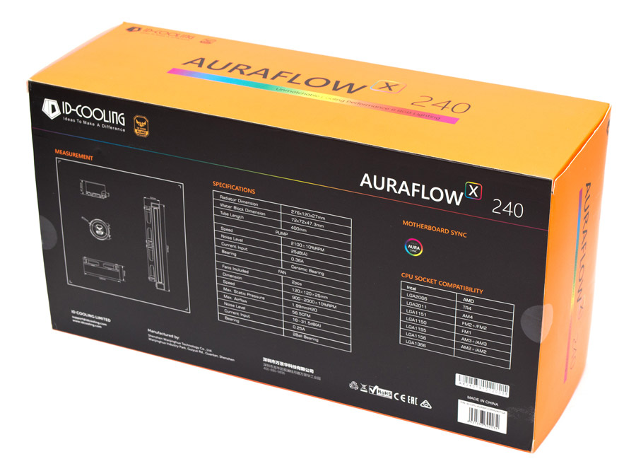 Упакована ID-Cooling Auraflow X 240 TGA в стандартную для такого типа систем фирменную черно-оранжевую коробку. Спереди есть изображение продукта, сзади указаны его габариты, технические характеристики и типы поддерживаемых процессорных разъемов.