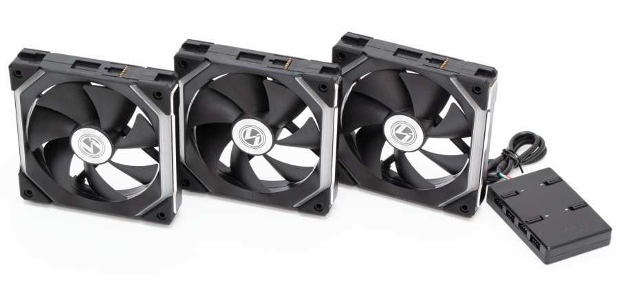 Вентиляторы Lian Li UNI Fan SL120 выглядят внушительно благодаря массивной пластиковой рамке с алюминиевыми вставками по бокам. Они бывают в черном и белом цвете исполнения в одиночной упаковке или в комплекте из трех штук и контроллера. Аналогичная модель в 140-мм размере имеет те же расцветки и варианты комплектации, но максимальный размер комплекта с контроллером состоит всего лишь из двух пропеллеров. Над внешним видом контроллера производитель заморачивался не так сильно — он выглядит, как пластиковая коробочка с глянцевой вставкой.