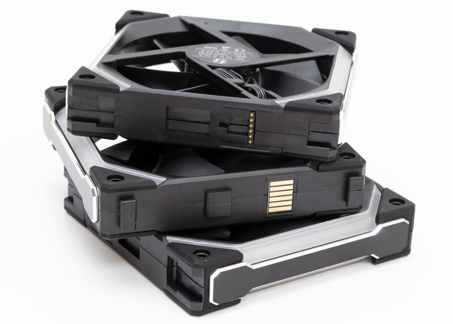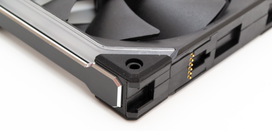 На верхней грани рамки находится шесть подпружиненных круглых контактов и четыре углубления для зацепов. С этой стороны можно присоединить кабель питания или другой аналогичный пропеллер. На нижней грани рамки расположено три пластиковых фиксатора и шесть полосок контактов, через которые подается питание и сигнал управления подсветкой с прикрепленного вентилятора.