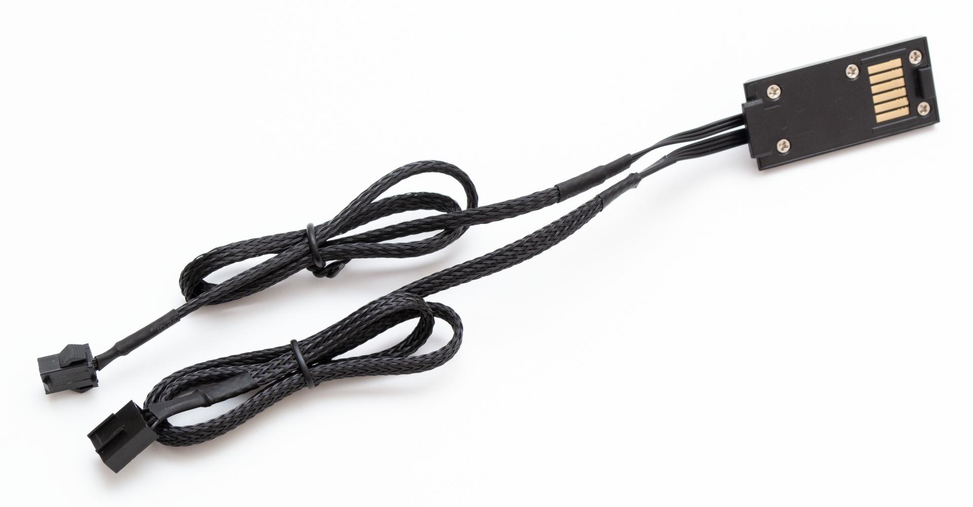 Внизу контроллера встроен USB кабель, длиной в 500 мм. Он нужен для прямого подключения к материнской плате. Слева от него разъем для провода питания SATA Power, справа — для подключения кабеля мониторинга оборотов и управления подсветкой.