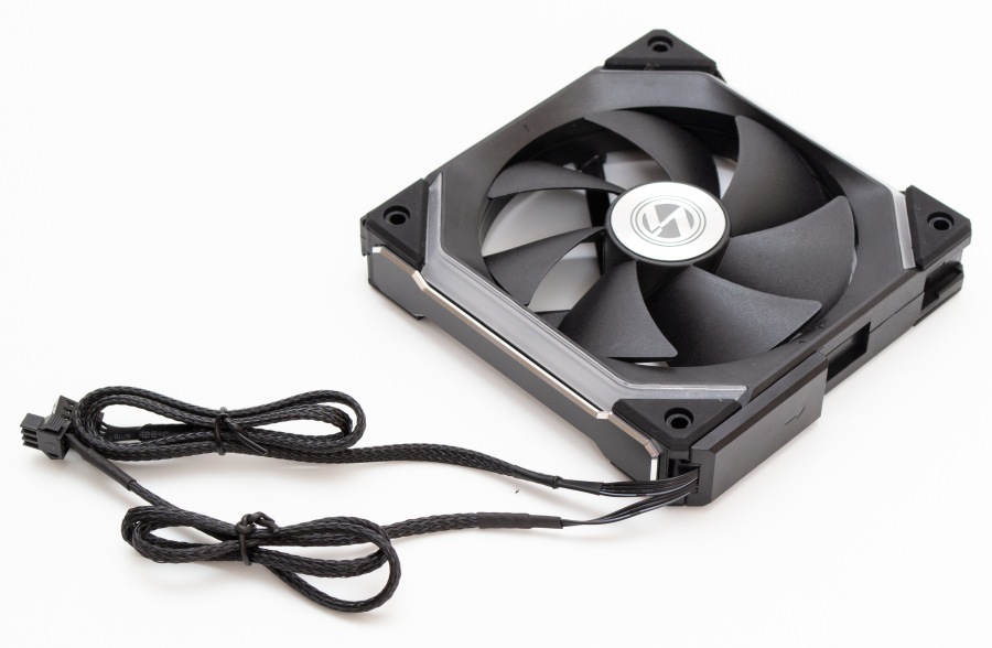 Хотя формально вентилятор относится к типоразмеру 120х120х25 мм, фактически габариты его рамки заметно отличаются. По бокам, где наклеены алюминиевые вставки, размер возрастает до 124 мм. Торчащие снизу пластиковые зацепы расширяют рамку до 123 мм по высоте, а если сверху закрепить колодку кабеля, то выйдут все 130 мм. При соединении эти моменты сглаживаются, посадочные отверстия совпадают со стандартными, но по краям конструкции и по бокам нужно предусмотреть запас места. Крыльчатка здесь стандартной конфигурации, диаметром в 102 мм с семью лопастями. Подшипник — гидродинамический, с кольцевым магнитом в роторе и дополнительным центровочным магнитиком посередине статора. Скорость вращения крыльчатки составляет от 800 до 1900 об/мин и управляется при помощи ШИМ. Пропеллер хорошо центрирован и сбалансирован. Вибраций и посторонних призвуков он практически не издает.