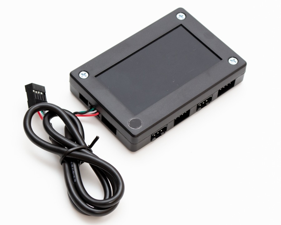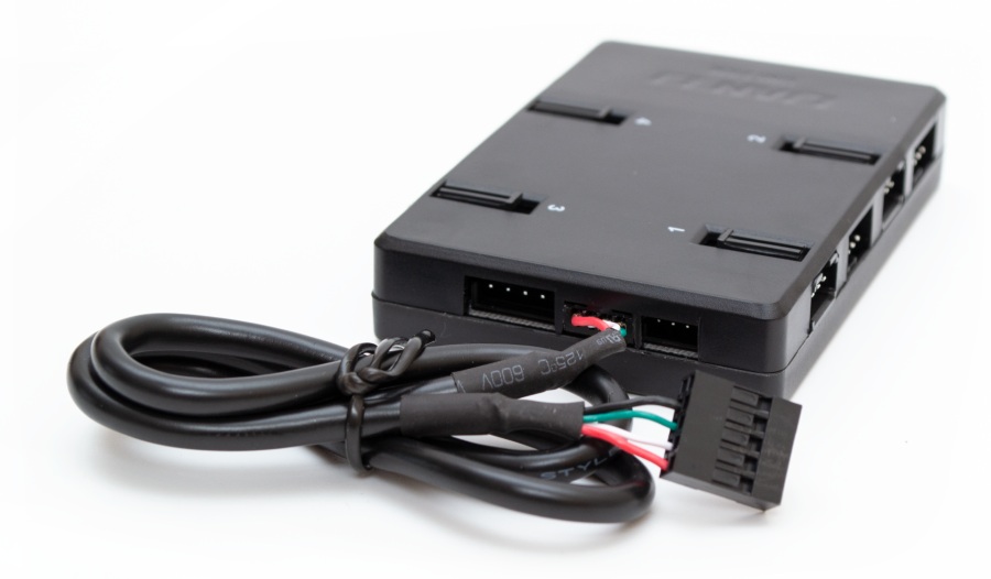 Контроллер имеет габариты 86х59х17 мм. На его лицевой части расположены нажимные защелки, помеченные цифрами от 1 до 4. Каждая из них удерживает трехконтактный разъем управления подсветкой. Дополнительно к этому с каждой стороны есть по два четырехконтактных разъема для вентиляторов.