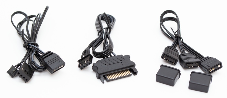 Из комплектных к контроллеру кабелей есть выход с трех контактов на разъем +5VDG для управления подсветкой и стандартный вентиляторный коннектор на четыре контакта. Длина провода — 500 мм. Далее следует кабель питания SATA Power, длиной в 300 мм и разветвитель +5VDG с одного разъема «мама» на два типа «папа» (с защитными колпачками) для подключения дополнительного элемента подсветки, длиной в 120 мм.