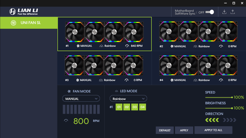 Драйвер для управления вентиляторами и их подсветкой требуется загрузить с официального сайта и установить. В распакованном виде он занимает порядка 227 МБ дискового пространства и остается постоянно активным. Из элементов управления здесь есть: ползунок в верхнем правом углу, переключающий управление подсветкой между контроллером и материнской платой, кнопки импорта и экспорта профиля настроек. Четыре слота с изображением вентиляторов показывают их номер, текущий режим управления скоростью крыльчатки, тип светового эффекта и текущую скорость пропеллеров. В управлении вентилятором можно выбрать ШИМ режим управления, тихий, скоростной, полную скорость или ручной. Обороты выставляются в пределах от 800 до 1900. В режимах подсветки есть 14 вариантов световых эффектов, для которых индивидуально определяется цвет, скорость, направление, яркость и прочие параметры. Каждый из четырех каналов управляется отдельно.