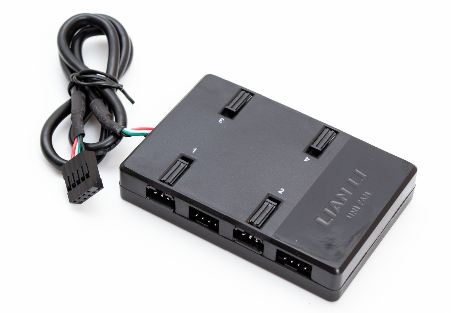 Контроллер имеет габариты 86х59х17 мм. На его лицевой части расположены нажимные защелки, помеченные цифрами от 1 до 4. Каждая из них удерживает трехконтактный разъем управления подсветкой. Дополнительно к этому с каждой стороны есть по два четырехконтактных разъема для вентиляторов.