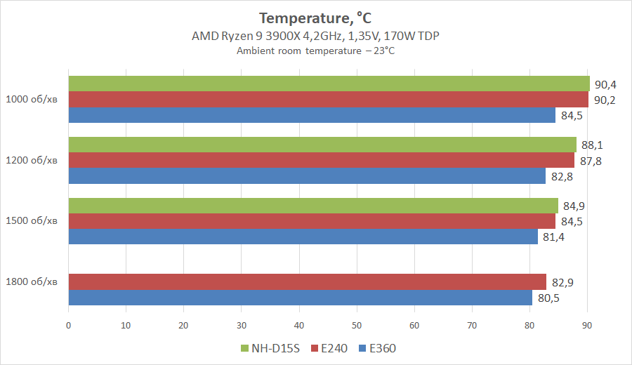 Системы охлаждения сравнивались по соотношению общей эффективности к уровню шума. Были установлены значения 1800, 1500, 1200 и 1000 оборотов в минуту.