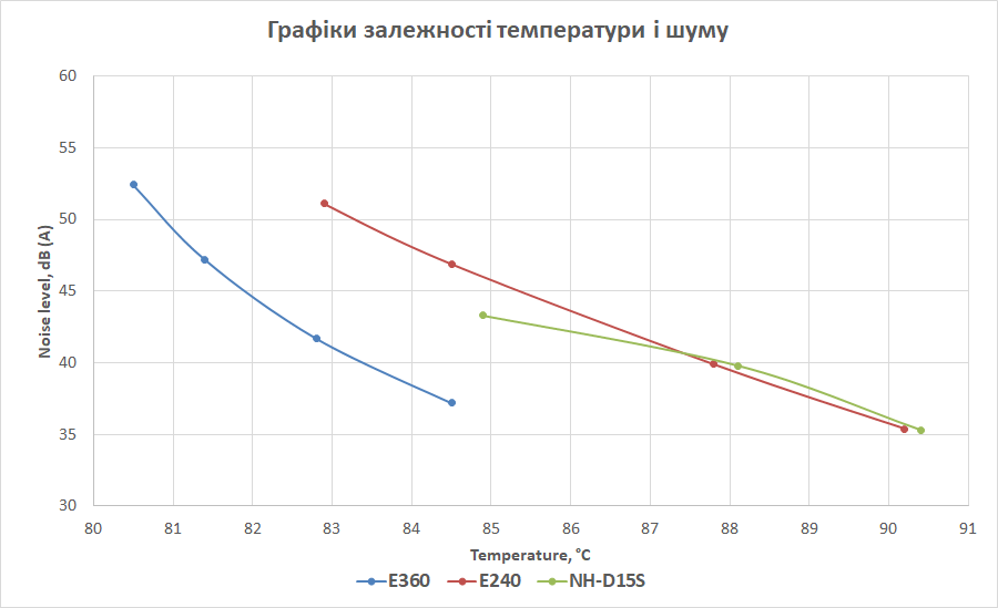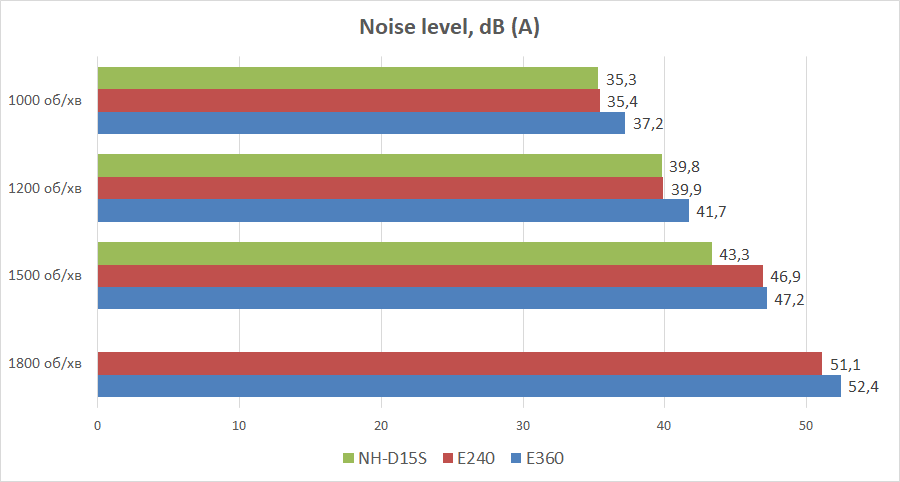 Теперь посмотрим на диаграмму сравнения шума на одинаковых скоростях вентиляторов.