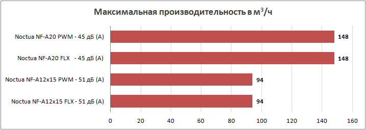 Как видно из результатов тестирования, и это вполне ожидаемо, 200-мм вентиляторы являются чемпионами по объему прокачиваемого воздуха. Что еще интереснее — благодаря технологиям Noctua им удается сохранять при этом относительную тишину. Но тонким 120-мм моделям технологии не помогли. Они, конечно, дотягиваются до показателей вентиляторов со стандартной рамкой, но 1850 об/мин делают свое черное дело, создавая акустический дискомфорт для пользователя.