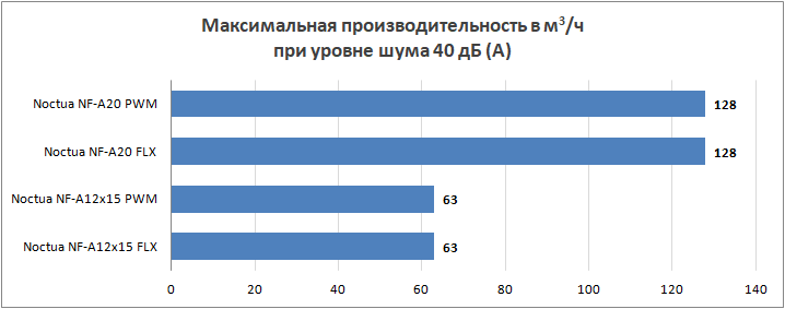 При снижении уровня шума до заветных 40 дБ (А), при которых вентилятор практически не слышим в закрытом корпусе, картина особо не меняется. 200-мм пропеллеры Noctua лишь незначительно (около 13% от номинала) проседают в своих показателях. А 120-мм модели с тонкой рамкой теряют чуть больше трети своей производительности.
