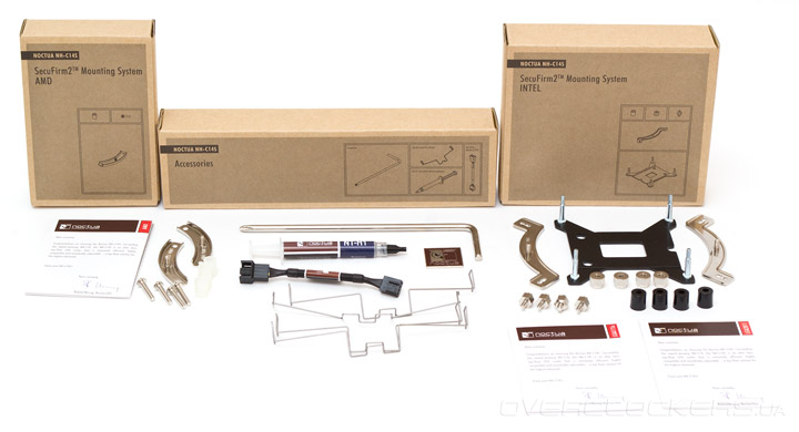 Комплект поставки кулера достаточно стандартен и похож на все то, что содержится в других аналогичных упаковках от Noctua. Все детали заботливо разложены по отдельным пакетикам и коробочкам. Помимо вентилятора и радиатора здесь есть: