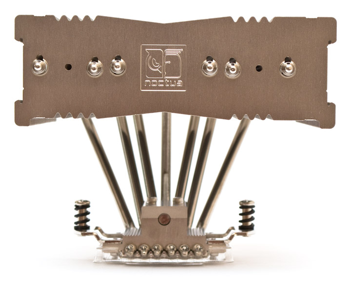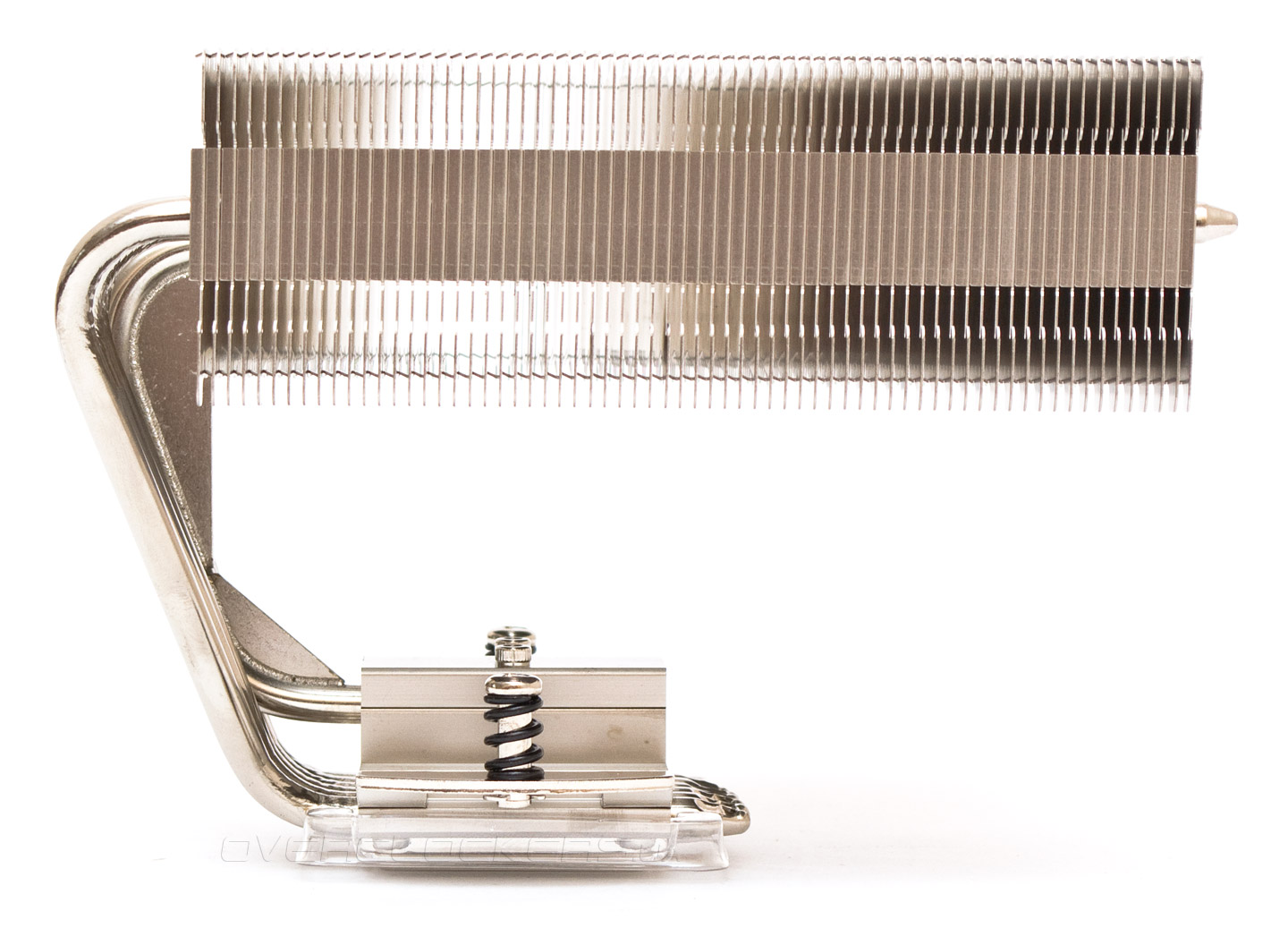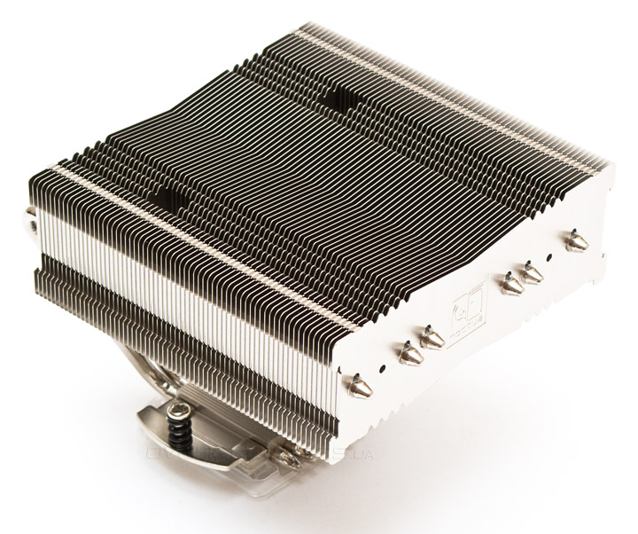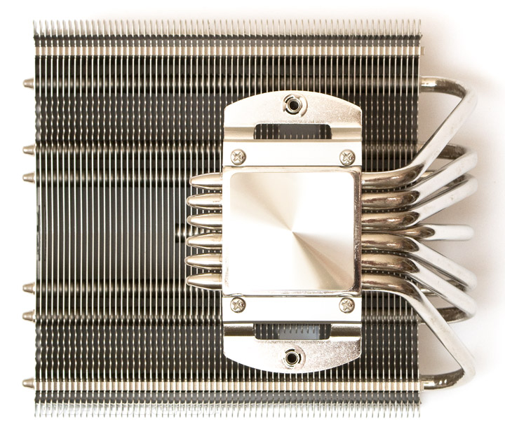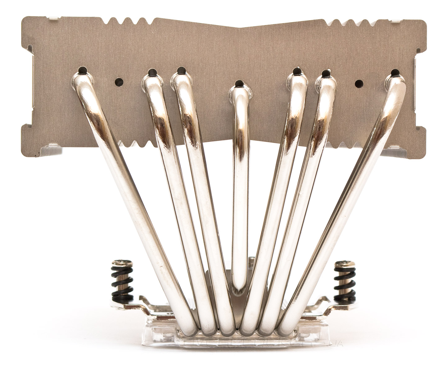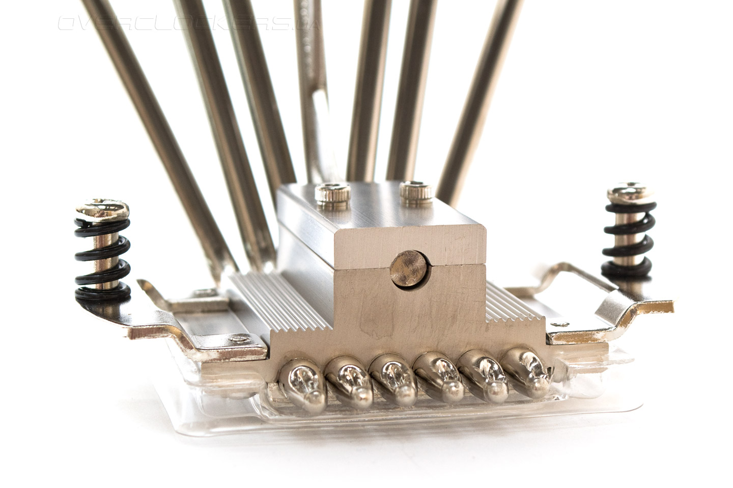 Шесть тепловых трубок плотно запаяны в основание кулера. Сверху, над подошвой, имеется еще одна надстройка, удерживаемая двумя винтами, которая служит для крепления центрального ребра жесткости. Две крепежные планки по бокам снабжены подпружиненными винтами.