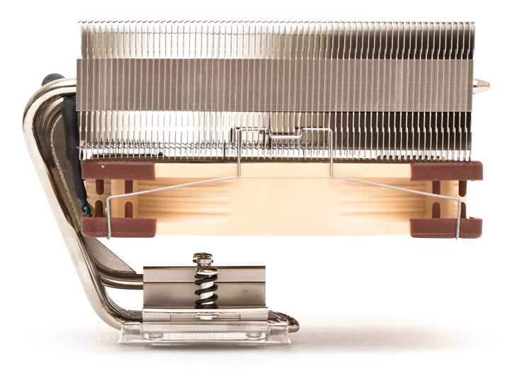 Высота радиатора выросла на 10 мм относительно предшественника, и теперь его минимальный габарит по данному параметру составляет 115 мм, а в сборе с вентилятором и вовсе 142 мм (против 130 мм у старенького NH-C14). К несущему каркасу посередине припаяны дополнительные продольные ребра жесткости, в виде двух небольших треугольников.