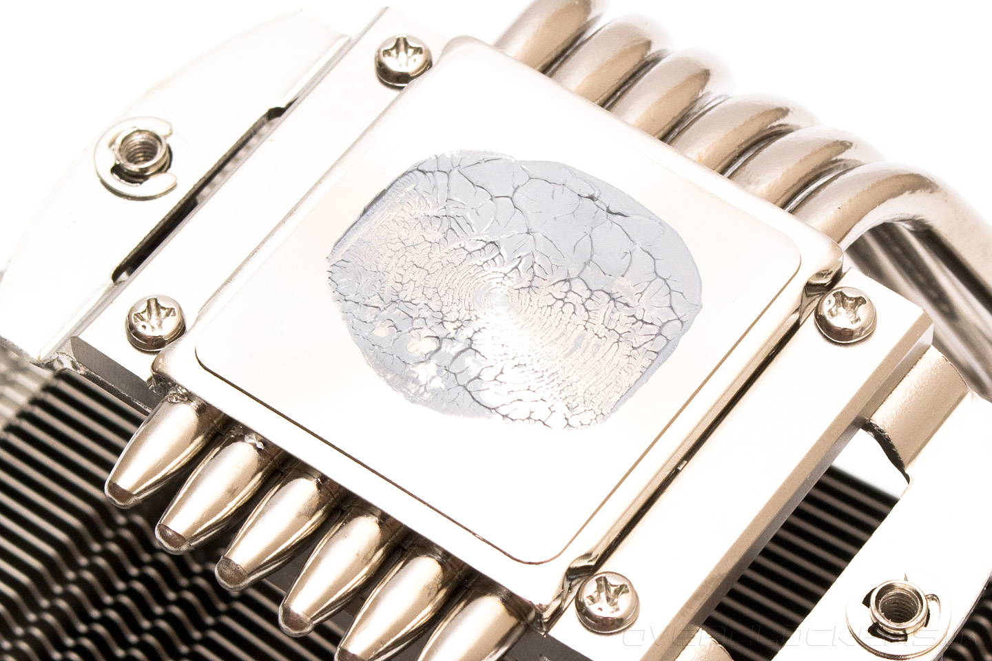 Отпечаток термоинтерфейса на подошве кулера подтвердил мои опасения по поводу конической формы основания. Как видим, более менее плотный контакт достигается лишь в центральной зоне, в то время, как значительная часть тепло-распределительной крышки вообще никак не контактирует с кулером. Это наводит на грустные мысли по поводу общей эффективности Noctua NH-C14S, но давайте посмотрим на результаты теплового теста.