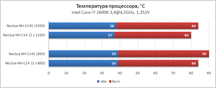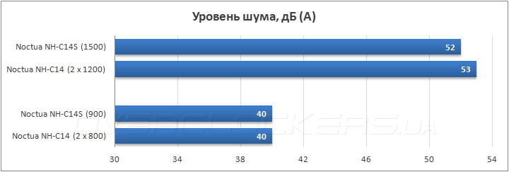 Системы охлаждения сравнивались между собой по соотношению уровня шума к общей эффективности. Оба кулера тестировались в стоковом состоянии, то есть со всеми комплектными вентиляторами. В качестве точки отсчета для минимальных оборотов был взят условно-бесшумный порог в 40 дБ (А) — уровень шума практически не различимый из закрытого корпуса ПК. Вентиляторы NH-C14 продемонстрировали этот шум уже при скорости 800 об/мин, в то время, как один пропеллер NH-C14S достиг порога при 900 об/мин. На максимальных для каждой системы охлаждения скоростях разница тоже получилась небольшой. NH-C14 выдал 53 дБ (А) шума при 1200 об/мин, а NH-C14S — 52 дБ (А) при 1500 об/мин.
